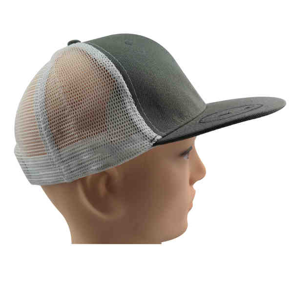 Trucker cap with 6 panels, 2 front panels with Acrylic, other panels with mesh material. Adjustable plastic snap tab closure, free shipping.