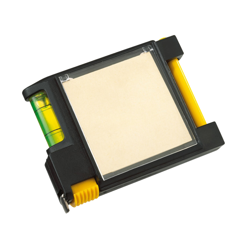 The Combo Tape Measure includes a 10-foot retractable, locking tape measure and a built-in level. Includes a yellow sticky memo pad, mini pen and a metal belt clip. Locking button on bottom of item keeps tape in place while a clear flip-top cover protects the memo pad.