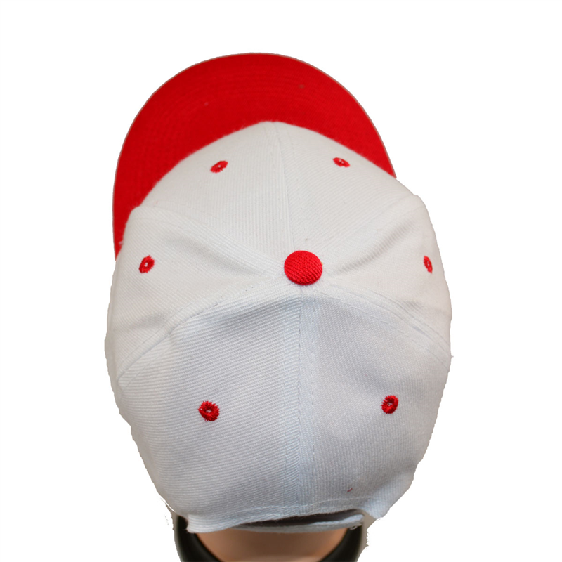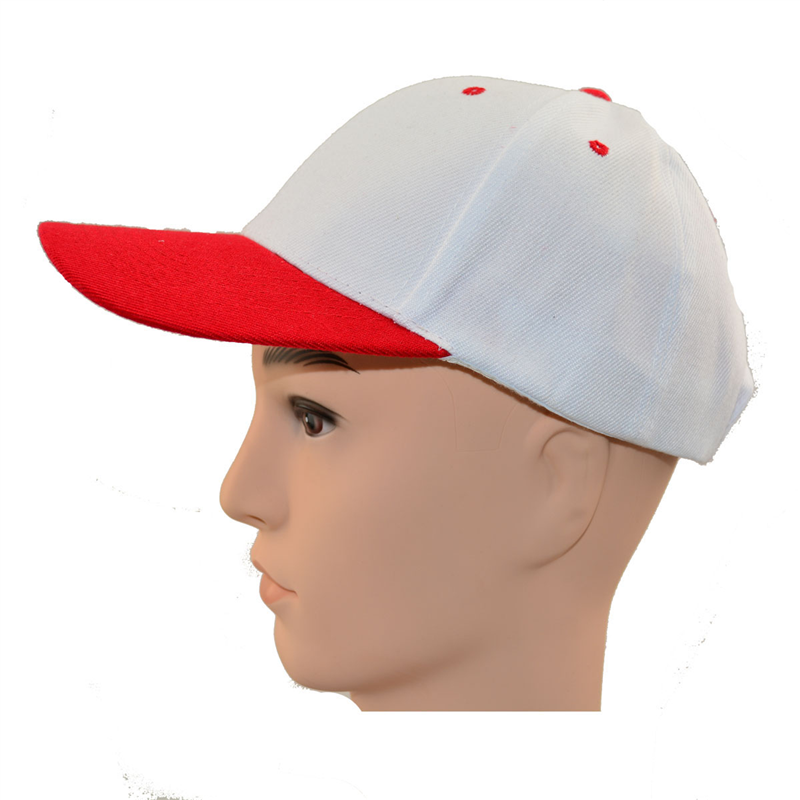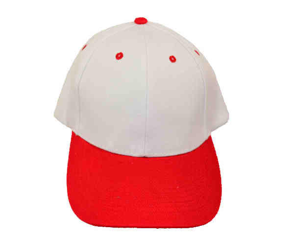 Red visor and eyelets, game-dedicated baseball hat. 6 sewing on red visor, white crown, velcro closure and Acrylic material with 6 panels, all color is avaiable.