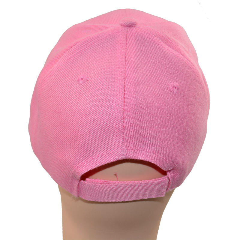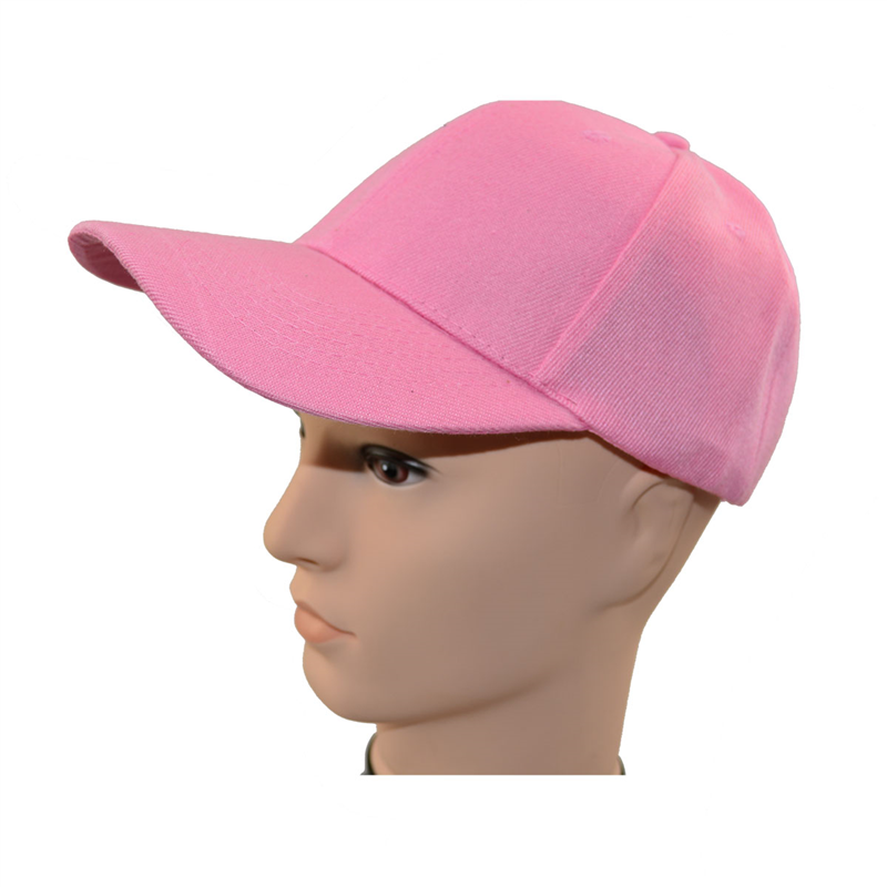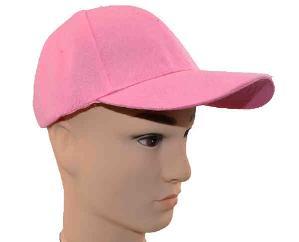 Pink baseball cap with 6 panels and 6 sewing on visor. Acrylic material, velcro closure, all colors are avaiable.