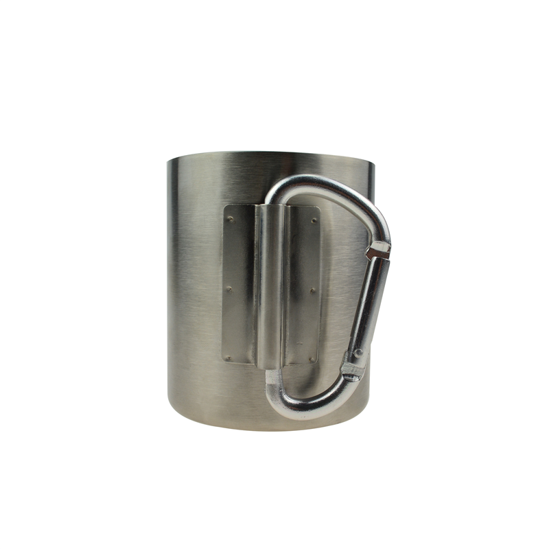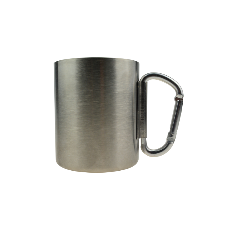 It's an 16 oz. stainless steel mug with an aluminum carabiner as the handle, making for a fun item to see and hold. The carabiner can rotate around. Your company logo can be customized.