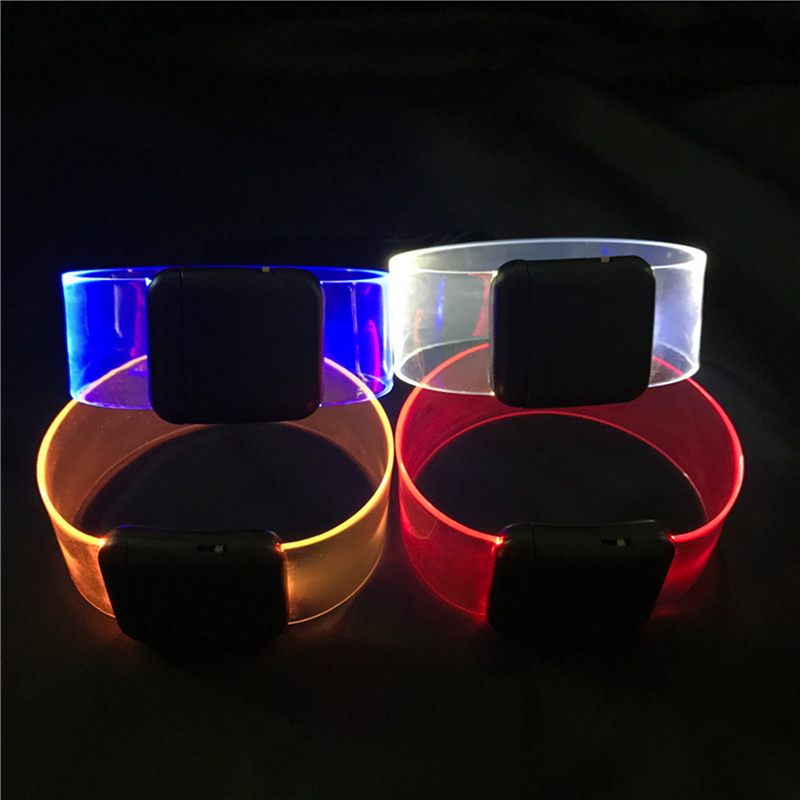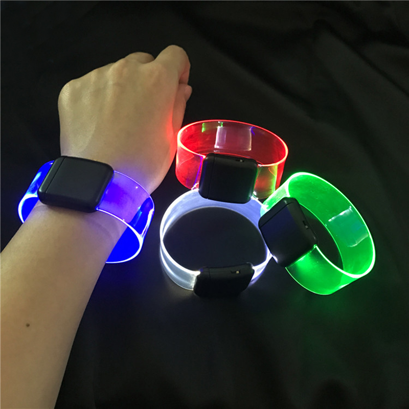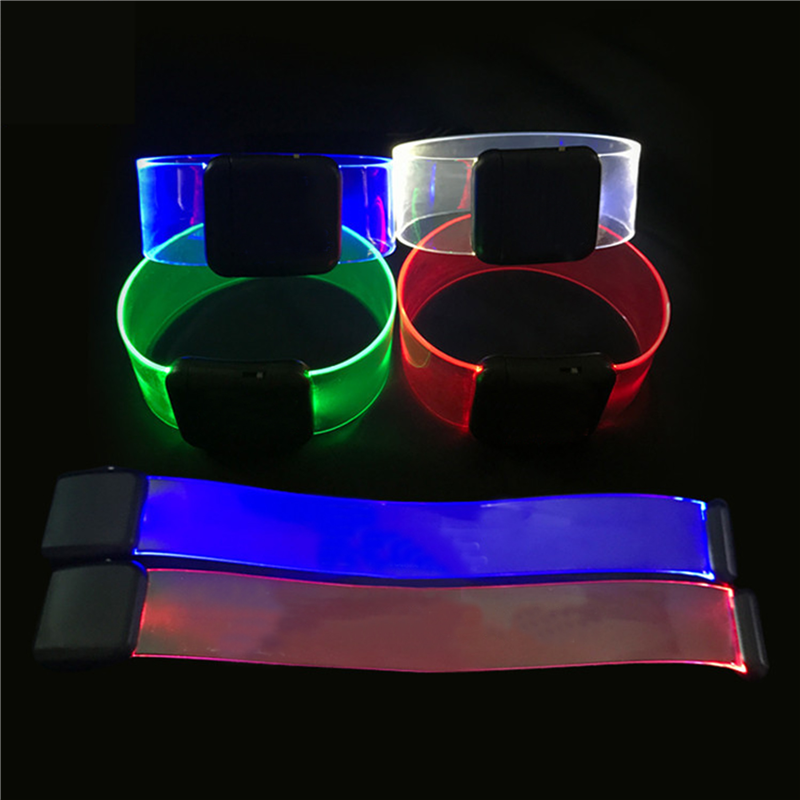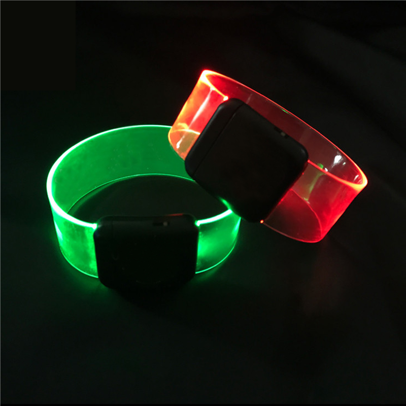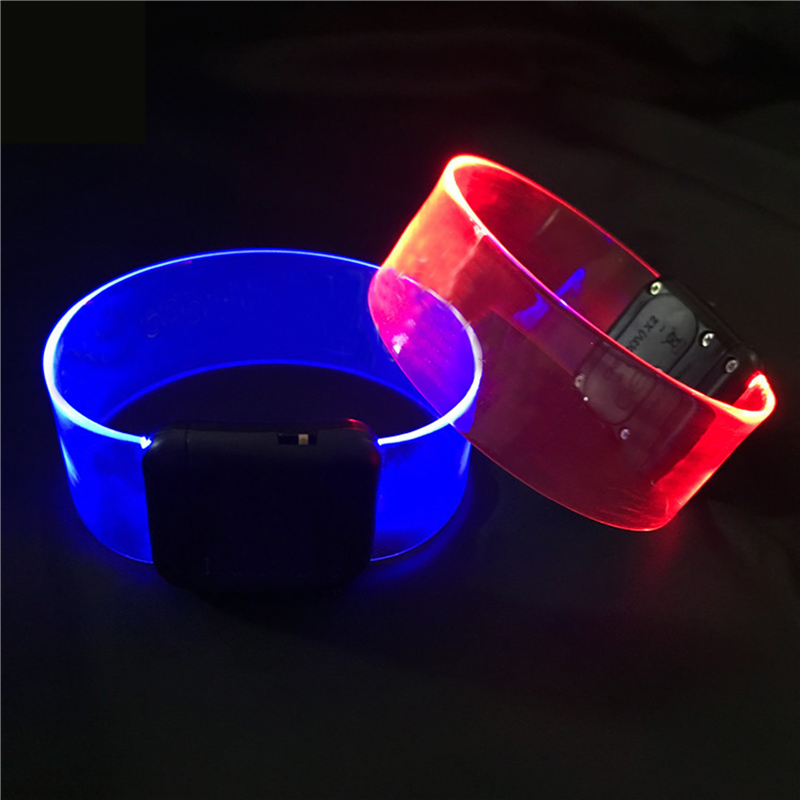 This bracelet is made of PVC and ABS. It can emit colorful light. Really a good item for concerts, bars and party. The logo can be customized on it.