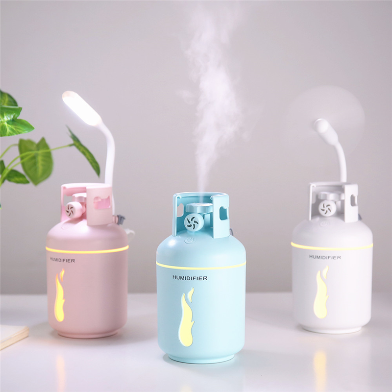 This Desktop Humidifier produces a cool mist to replenish moisture in dry areas. 300ML water bottle can last for 6-7 hours. Included LED light,USB fan makes it perfect for office and home use. It can also be used as a night light. Total three color for choose and logo can be customized. Connects directly to any USB port. Material: ABS. 5.78" H x 3.15" Dia certificated by CE and ROHS
