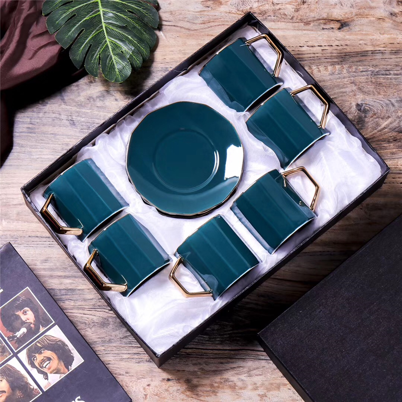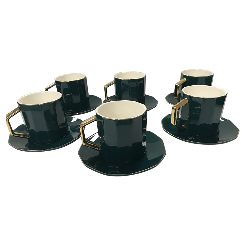 The Ceramic Cup&Saucer Set includes 6 cups and 6 saucers.The color is peacock green, that looks very nice. Surely you can customize your logo on the cups and saucer.