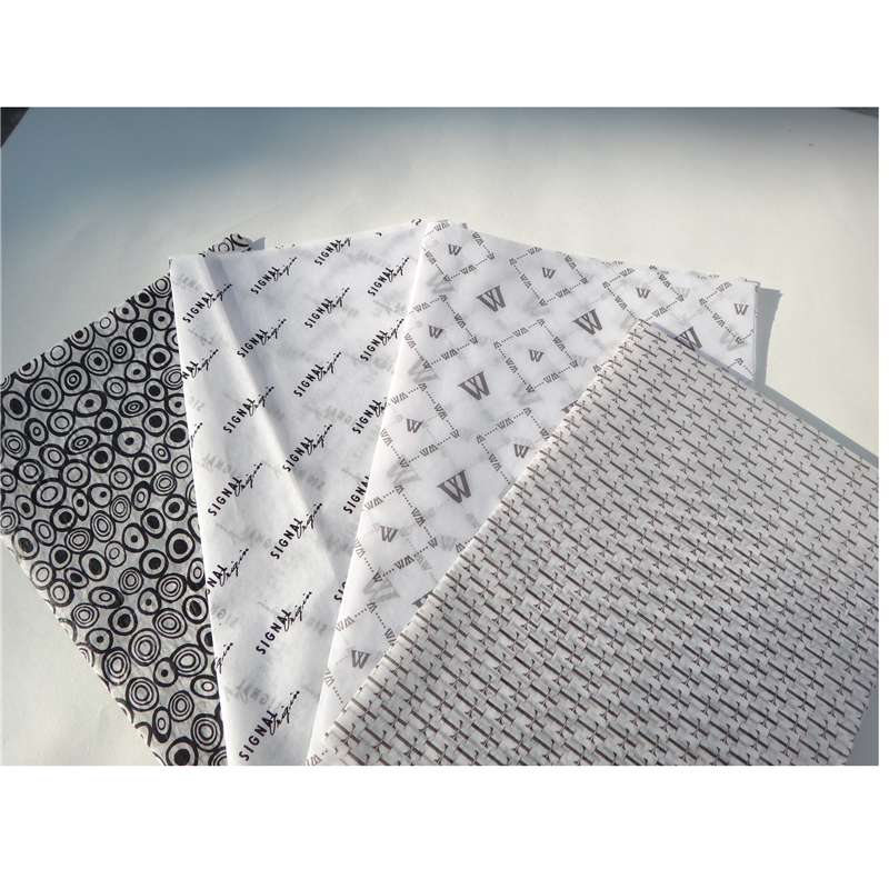 Quality custom printed tissue paper. Standard 17gsm weight. With step & repeat imprint pattern. Perfect to pack the clothing, accessories, wine, flowers etc.. The size is 20" x 30".