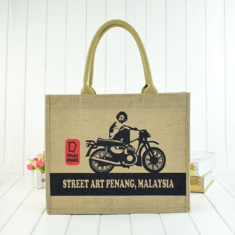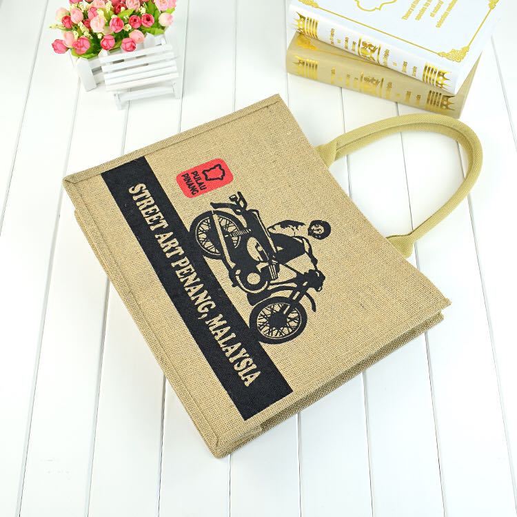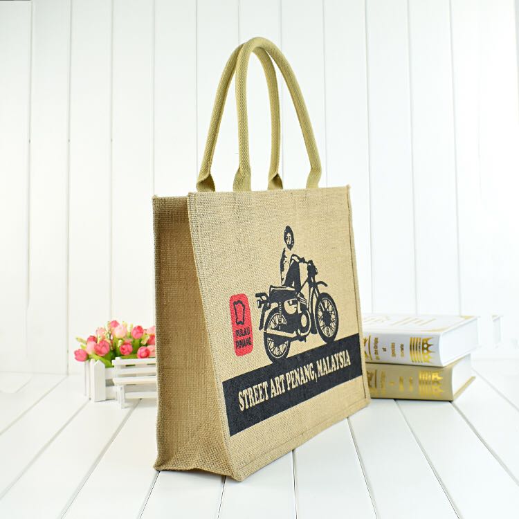 The bag made of natural jute with vine handle, and polypropylene laminated interior, natural fibers. Its size is 12.5" x 9.8" x 3.94". This linen bag is good for everyday shopping. It is easy to carry. The jute material is strong, durable, reusable and bio-degradable High quality bag, and can do the customized logo as request.