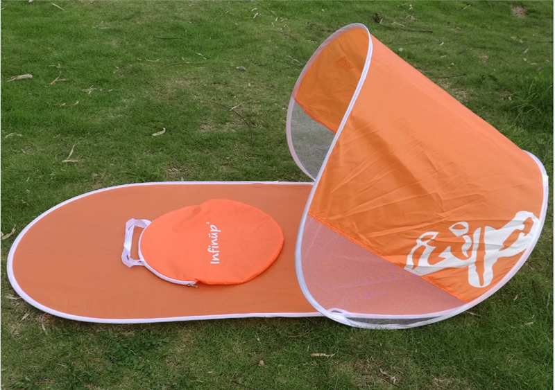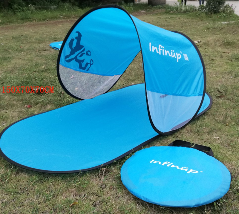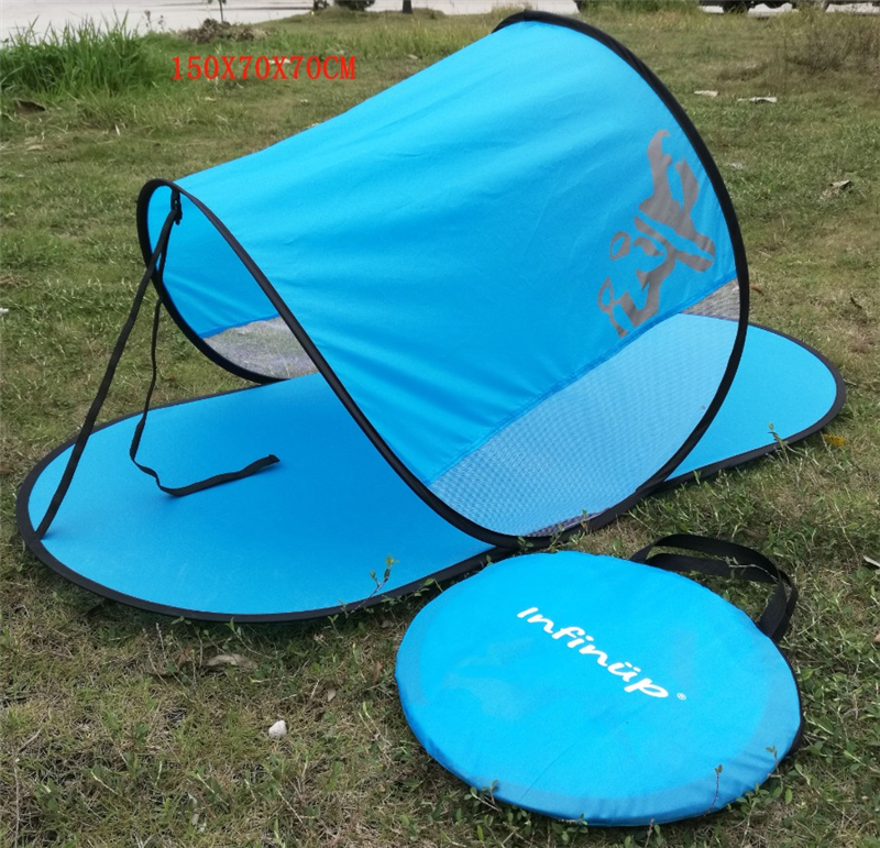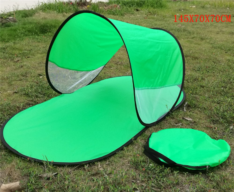 Pop up sun shelter with waterproof polyester floor. Comes in steel wire frame and storage bag with carrying strap. Larger space, stable structure, suitable for beach, lake, parks and other places. Popping up automatically with removing the pouch. 55" L x 27 1/2" W x 23 1/2" H