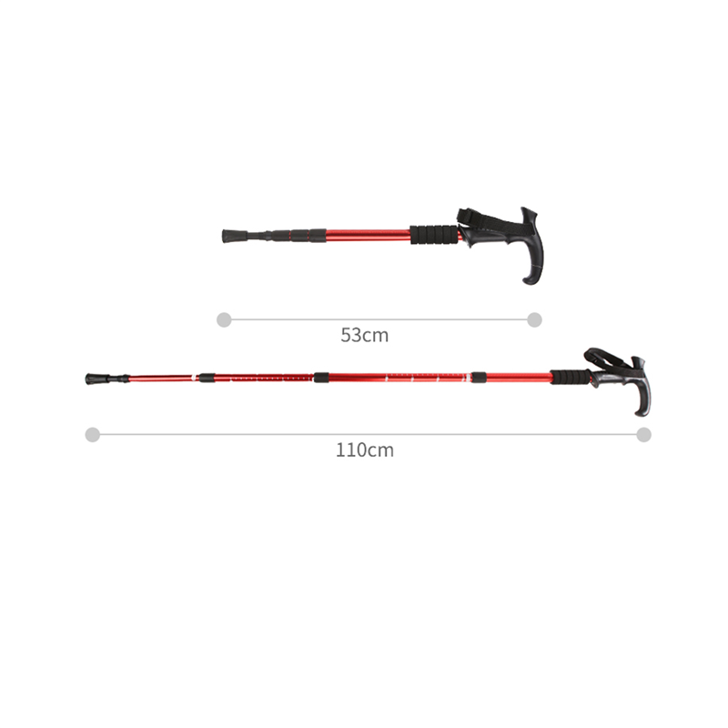 The material of this trekking pole is aluminum alloy + plastic + tungsten steel. This item is scalable. The length was 53cm before stretching. The length is 110cm after stretching.The use of trekking poles can improve the stability of walking and protect the joints from waist injuries. It can be used to climb snowy mountains,daily hiking, through forests and deserts.It can be printed with logo.