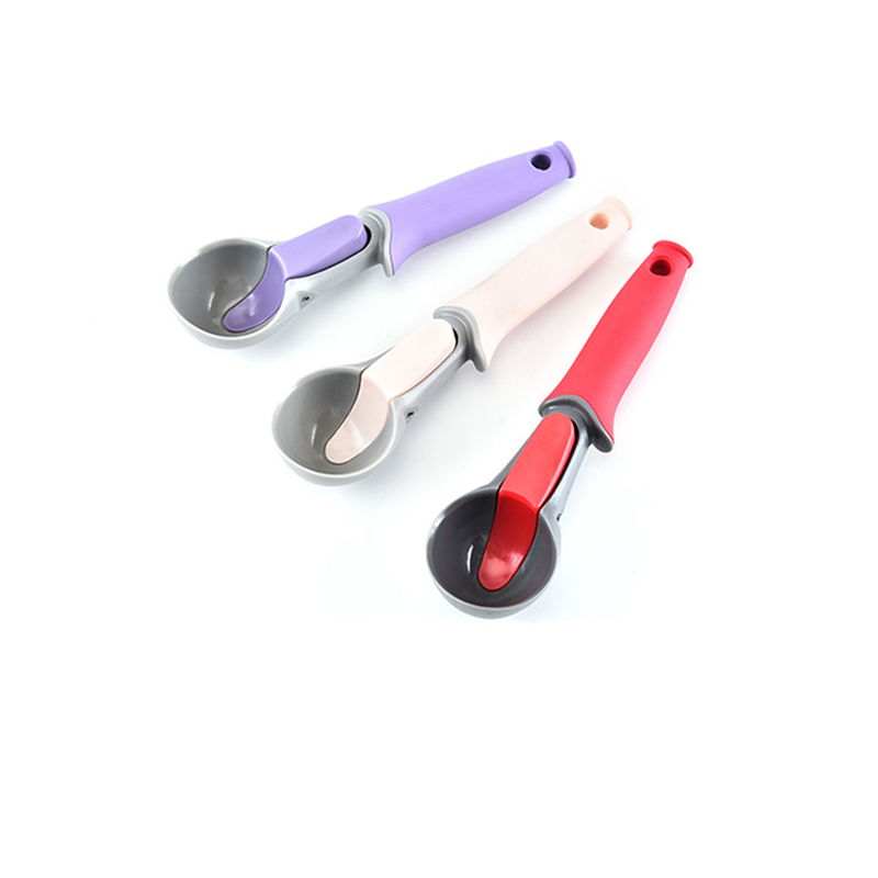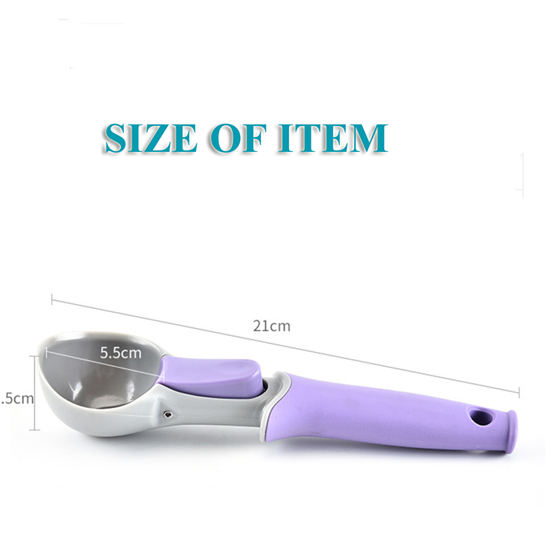 The material of this ice cream scoop is PS + TPR.It adds a button on spoon head.So the ice cream can be poured out easily.It can also be used to dig fruits into balls.We can make the spoon with the color you need.Can custom logo and company name.