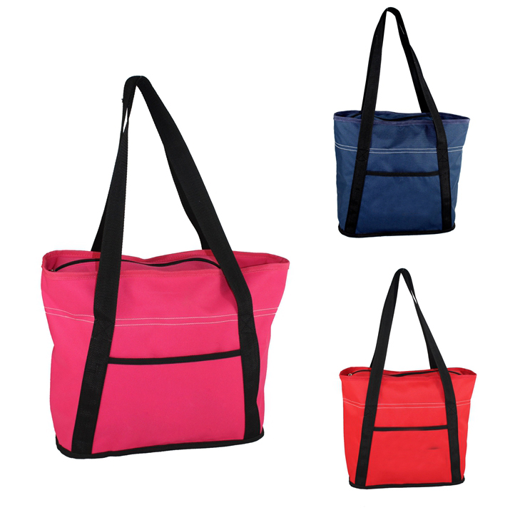 The Strapped tote bag is made with 600D polyester. It has a large main compartment, front pocket with hook and loop closure and 25" handles.