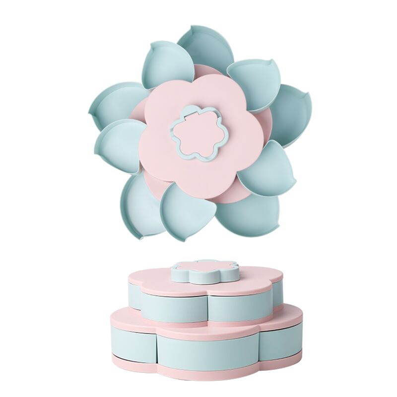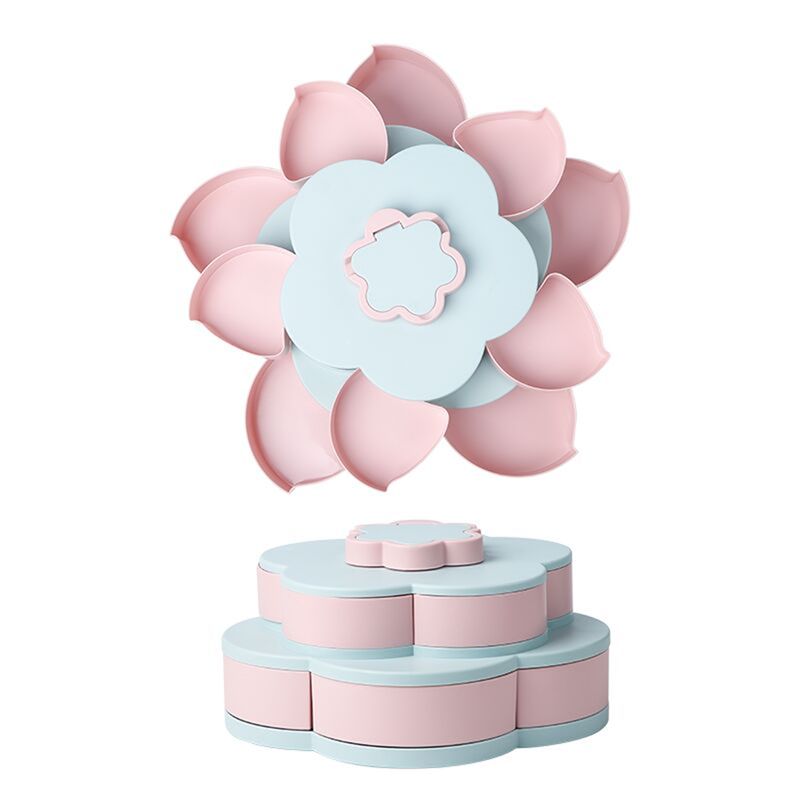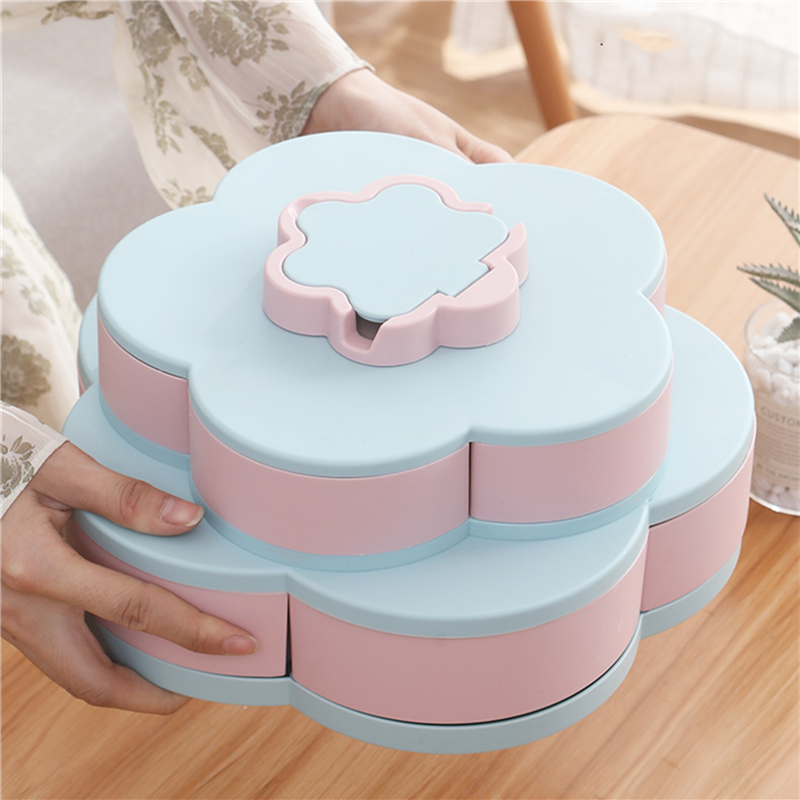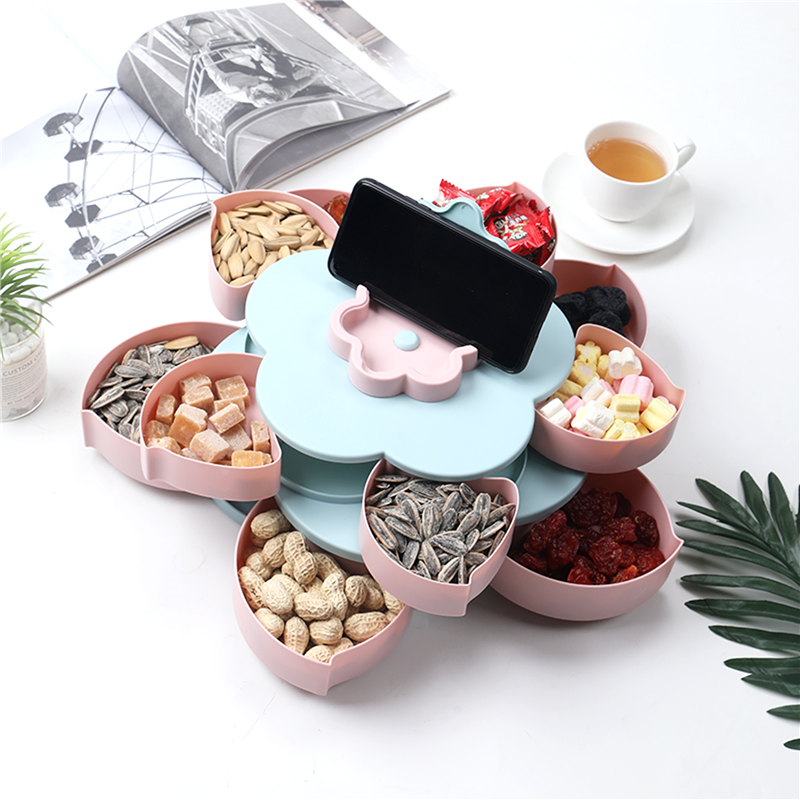 The snack storage box is designed as a double layer with a total of ten compartments. It can store 10 different snacks and dried fruits, and the food can be stored without mixing. Its design is very creative. You can open the box by rotating and display various foods, which is very convenient and fast. And add a mobile phone slot, design every detail wholeheartedly, make your life happier. This product has a stylish appearance, versatility and high-quality design, which is very suitable for anyone.You can also customize the logo.