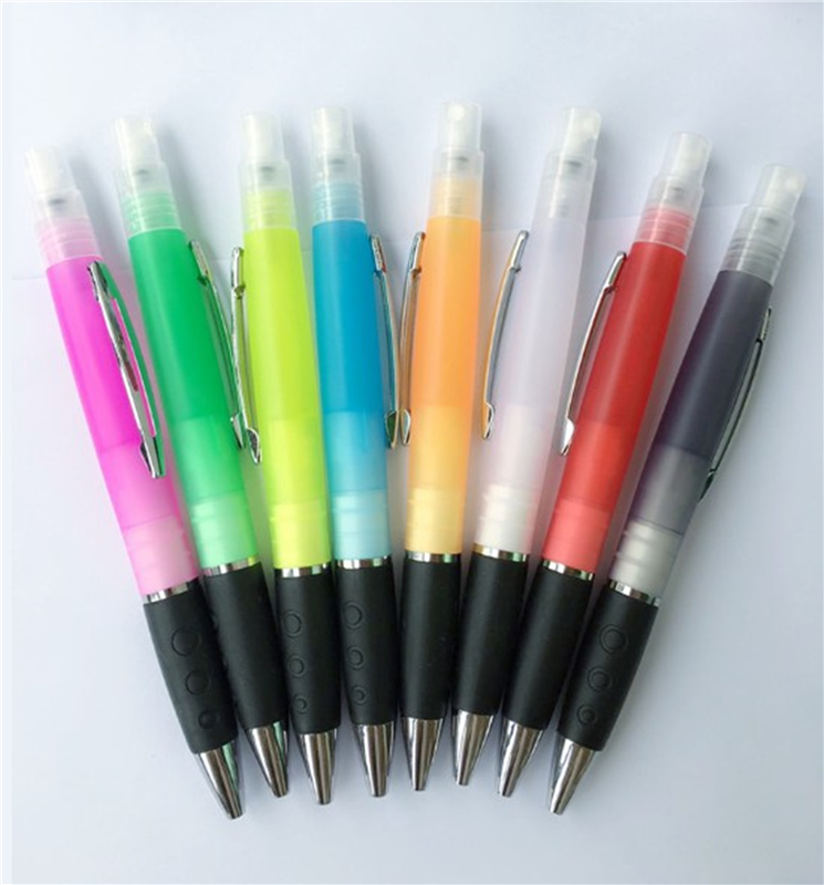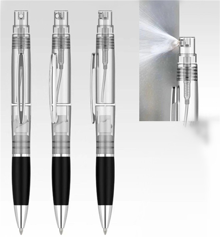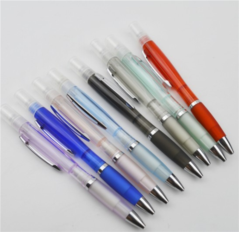 This ballpoint pen with spray equipment is very suitable for this special period of use. In addition to being used as an ordinary ballpoint pen, you can also add hand sanitizer for disinfection. The product is compact and easy to carry. Because hand sanitizer is now a special product, there are many export restrictions. Products without hand sanitizer are more convenient for export, so our product does not contain hand sanitizer.You can also customize the logo.