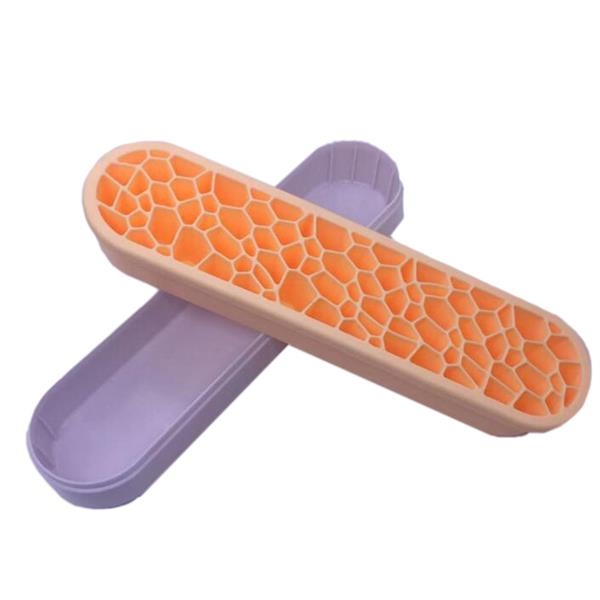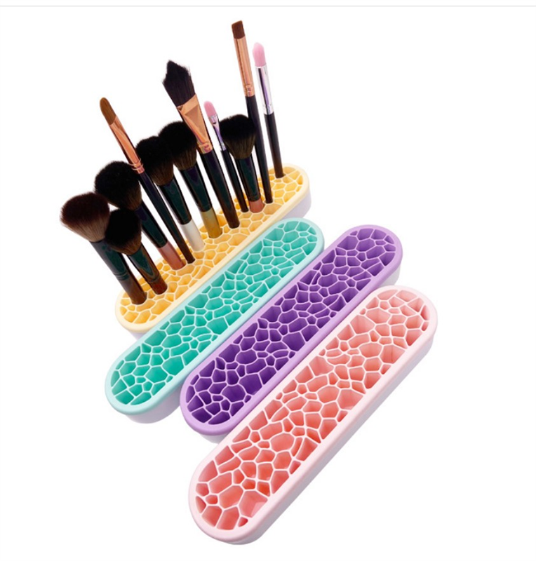This cosmetic brush holder is made of high quality silicone and plastic material with simple water cube design and novel appearance. It has large reserves and easy to carry. It can effeciently reduce the space for brush storage. Make-up becomes more easier after using it. Printing your logo on it is a great way to promote your brand. It comes in 4 colors:nordic green, nordic pink, yellow and purple