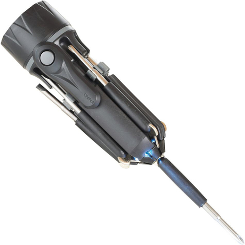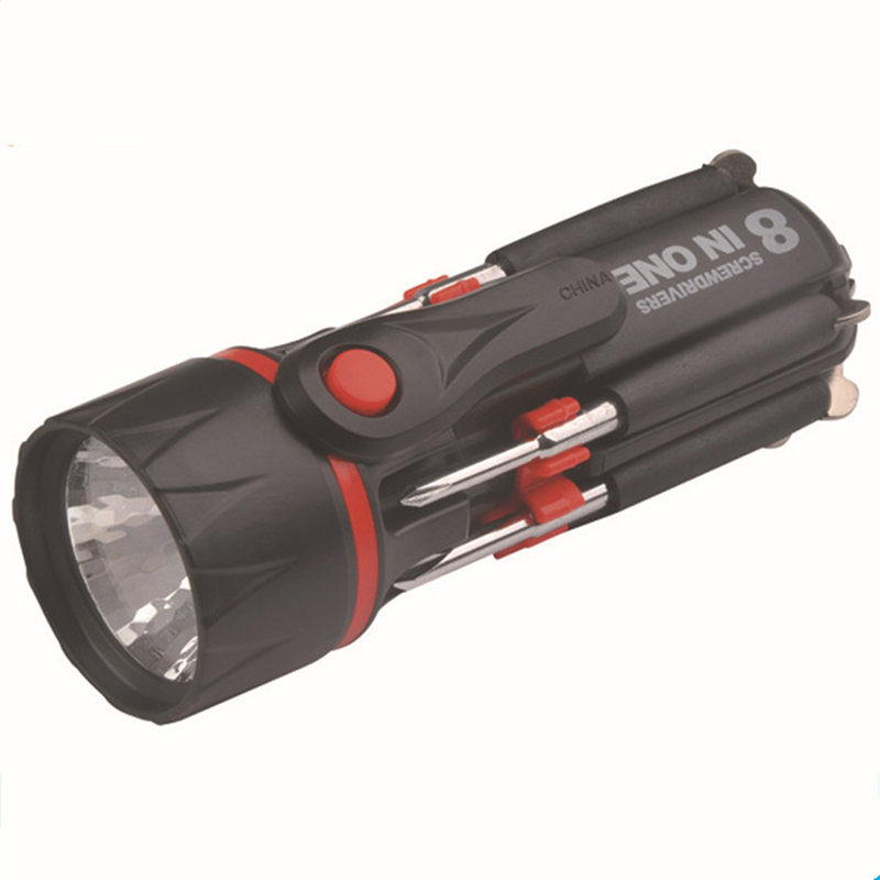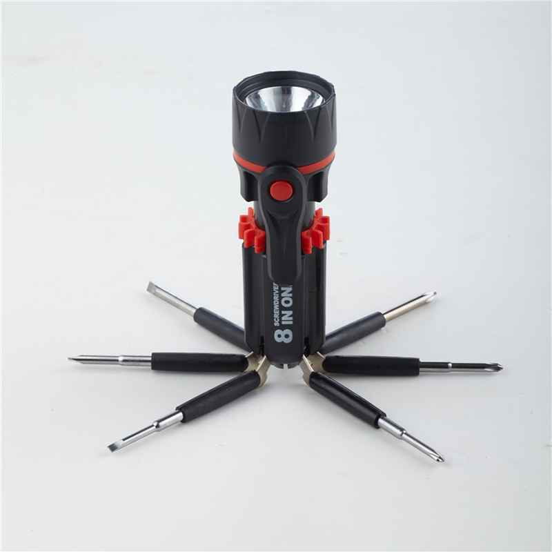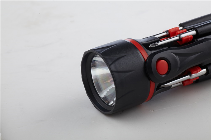 The material of this flashlight is ABS, PP, PA and 45# steel. It comes with eight different screwdriver bits. The flashlight is 0.8W and 30lm. It uses three AAA batteries for power. Our products are without batteries. Can custom logo and company name.