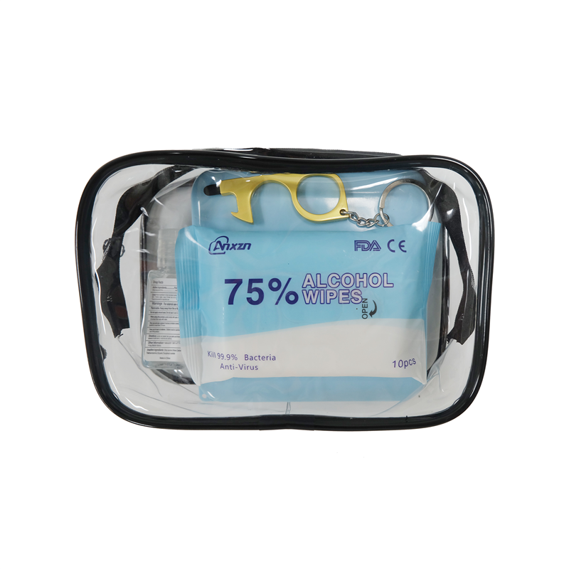 This epidemic prevention PVC bag is easy to carry and has a large capacity. This set contains one pvc bag, one 1OZ disposable hand sanitizer, one 10pcs wet wipes, one non-contact door opener and one mask box. The mask box can store disposable masks and KN95 masks. This suit product is very suitable for students and office workers. It is easy to carry and you can protect yourself anytime, anywhere.You can customize your own logo on the PVC package.