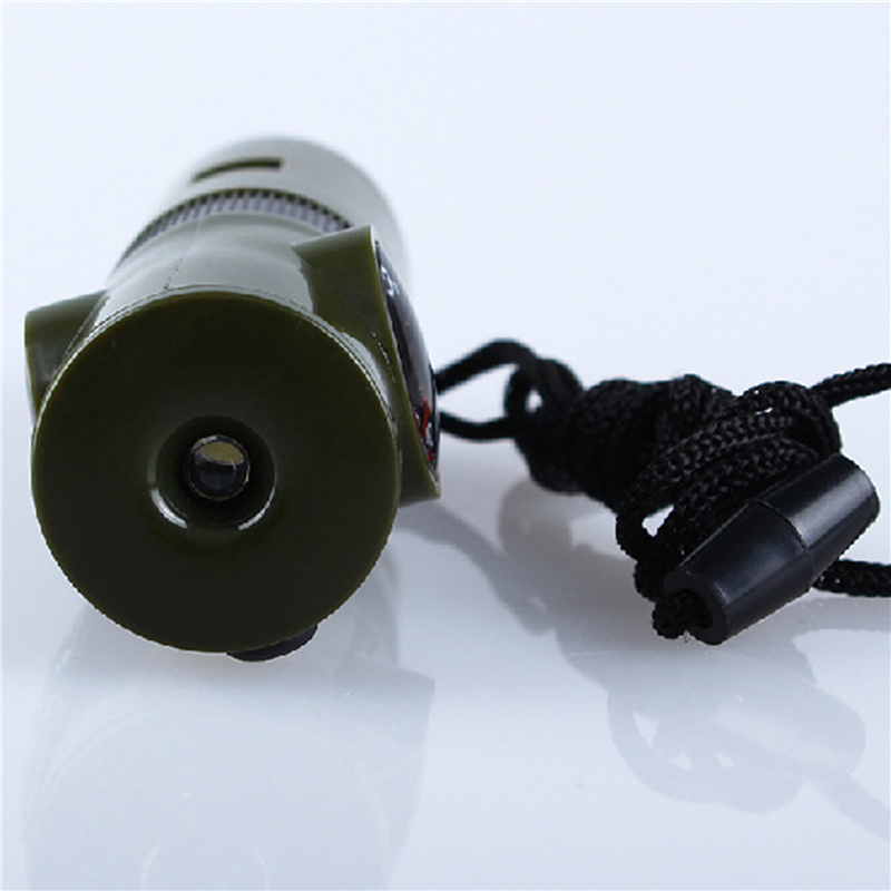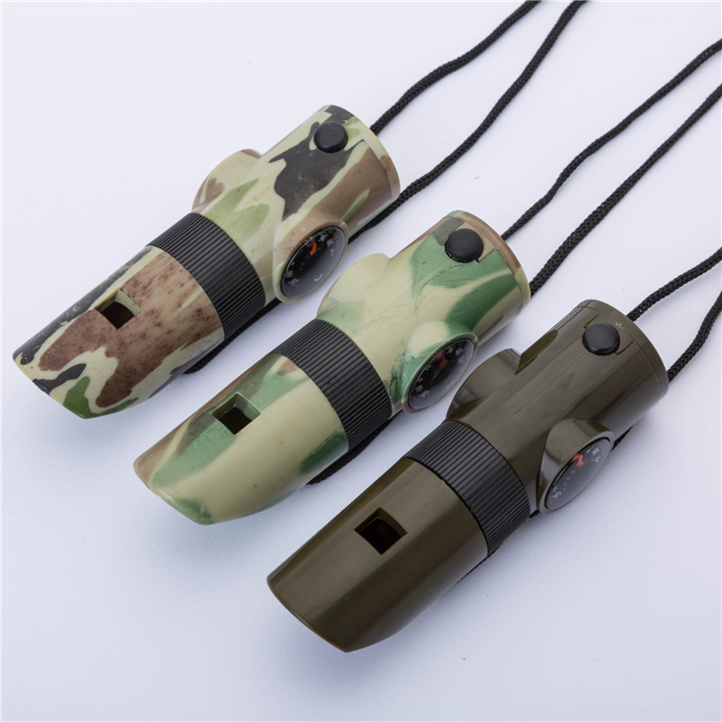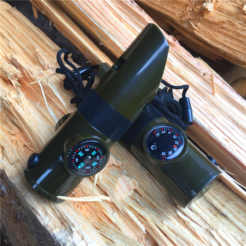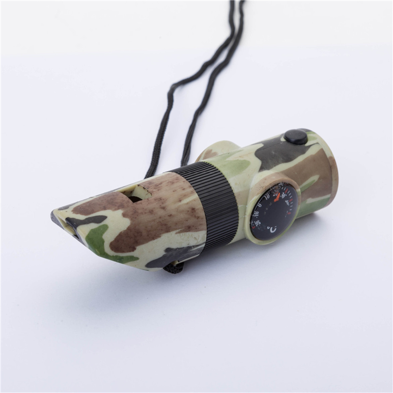This outdoor survival whistle has seven functions.The seven functions are: high decibel whistle, compass, thermometer, retroreflector (which use light reflection to show where you are so rescuers can find you in time), magnifying glass, LED flashlight, seal warehouse (can write your name, address, phone, blood type, etc., in it before going out activities, so rescuers can quickly understand your information).This 7-in-1 whistle is perfect for outdoor sports, camping, outdoor survival, etc.You can also print the company's name or logo on the surface of the product.