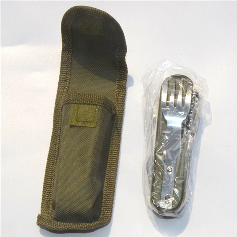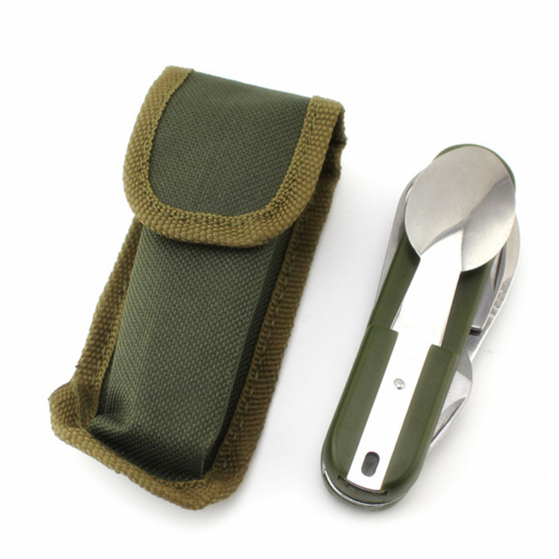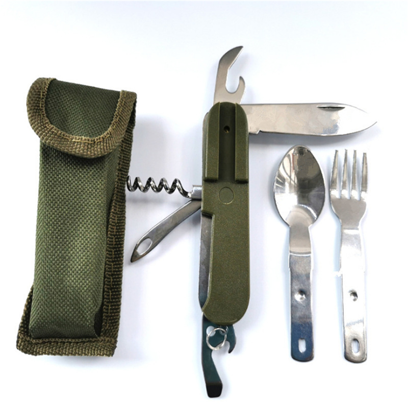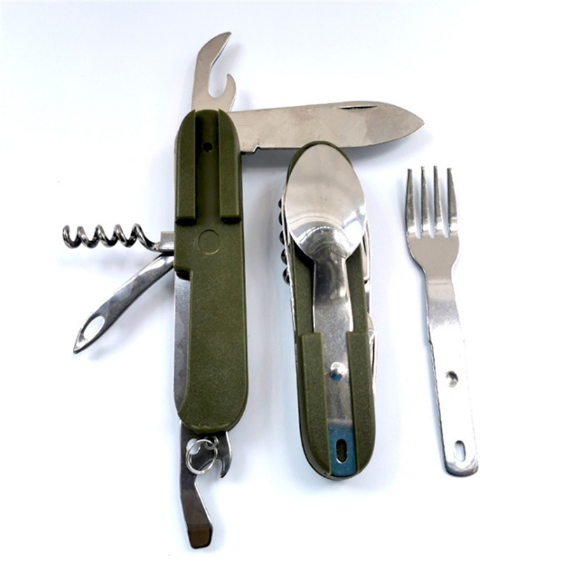 The material of this tableware is stainless steel. It is a multifunctional tableware that can be folded. It is composed of knife, fork, spoon, can opener, flat-head screwdriver, beer bottle opener, wine bottle opener, fishing line pulling hole. It is very suitable for camping and other outdoor use. The size after folding is 4"*1.5"*1". The color, shape and size of the logo can be customized