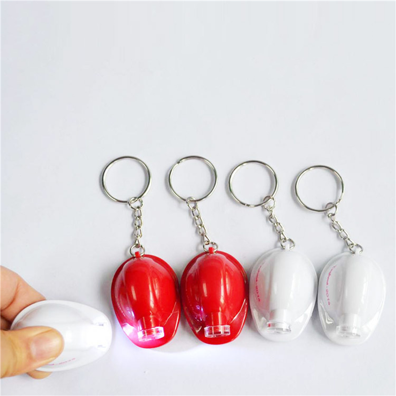 The material of this helmet is ABS. This flashlight keychain is very mini, easy to carry. It is suitable as gifts and promotional gifts. The shape, size and position of the logo can be customized.