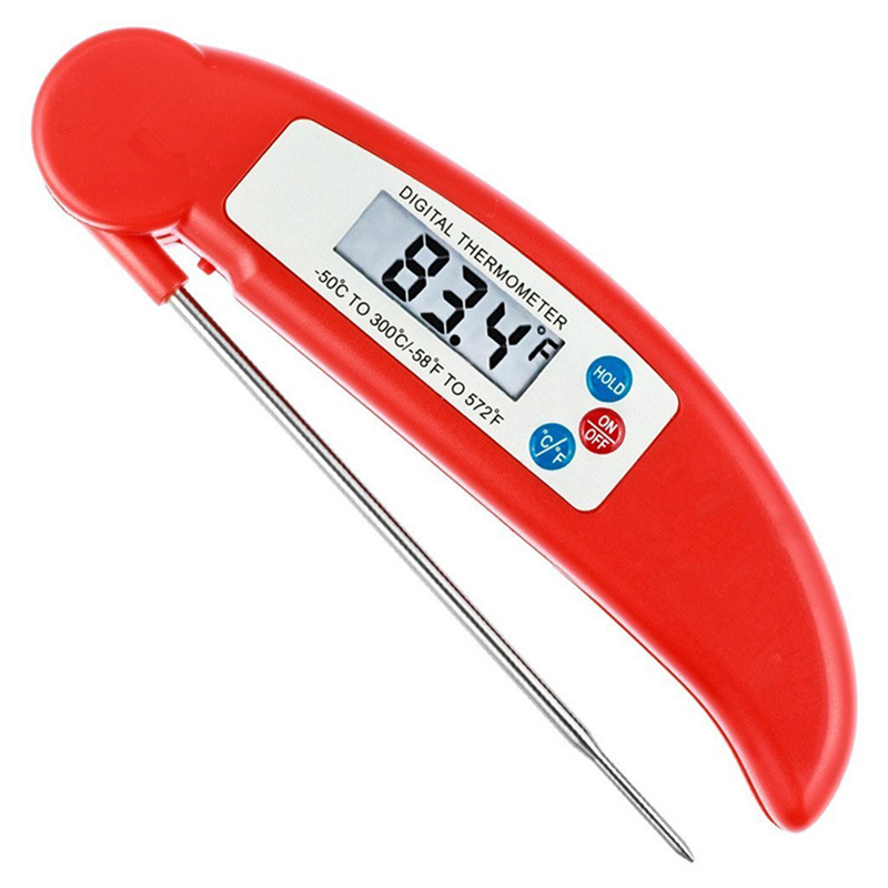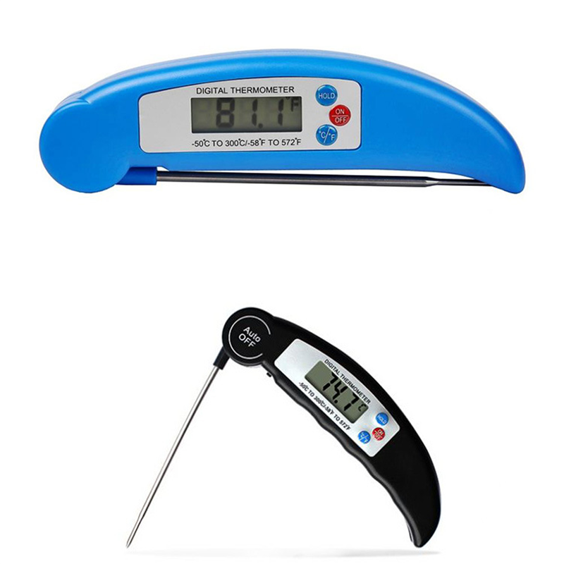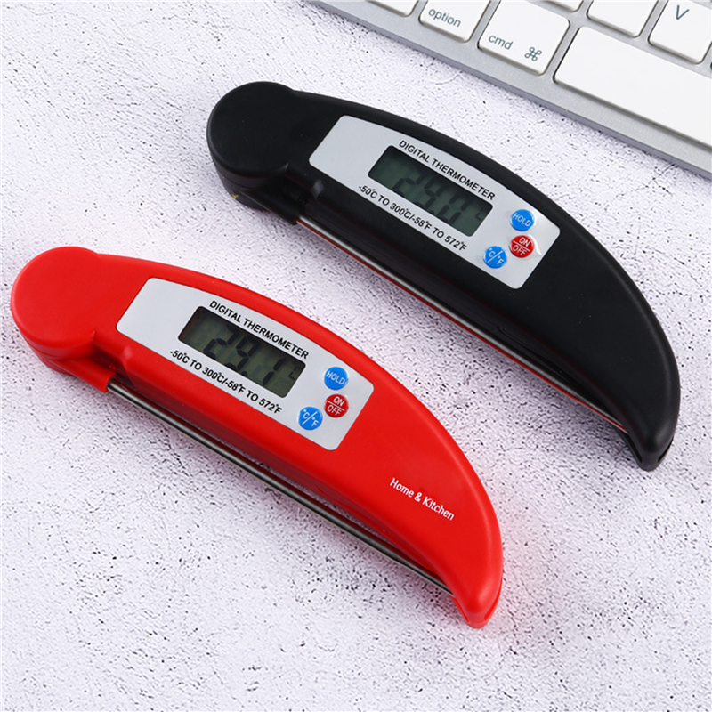The material of this thermometer is ABS+food grade stainless steel. Its measuring range is -58~572°F. Its probe is foldable. It is very suitable for cooking. It uses an AAA battery. Our products do not have batteries. The shape, color and size of the logo can be customized.