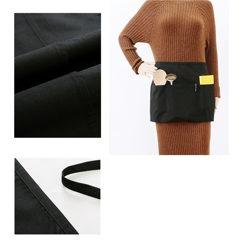 The material of this apron is cotton. It comes with three pockets. Suitable for coffee shops, bakeries, fast food chains, hotels, restaurants, gardens, homes, etc. The position, color and size of the logo can be customized.