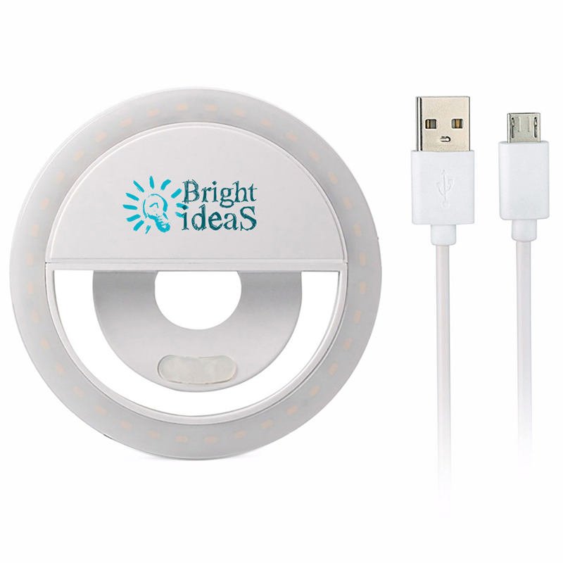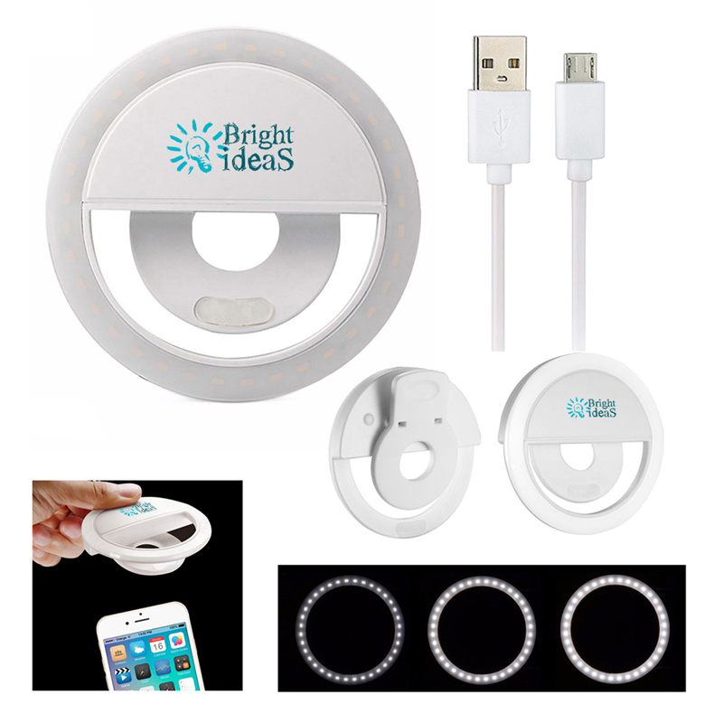 Take better selfies with our Selfie Ring Light. The clip and compact design ensure convenient travel and setup, while the 36 mini LED lights and ultra-wide range allow for perfect shots even at night time or in dark rooms. This Selfie Ring Light comes with three different light settings, which is ideal for photos, make-up, dark scenery photography, vlogging, & so much more. Also, keep your logo front and center by printing on the front of the Selfie Ring Light.3.35" W x 3.35" H x 1.16" D