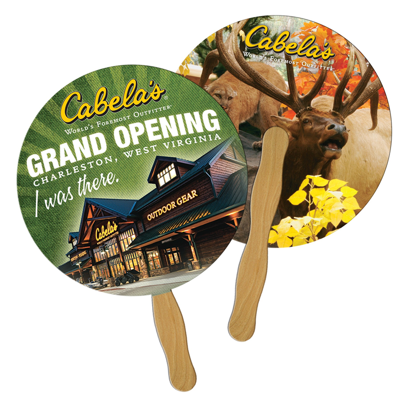 Four Color Process imprint white hand fan. Paper board with a wooden handle. Whether you decide to sponsor an event and pass this great product out there or if you just hand them out to passersby on scorching hot days, this hand fan is certain to bring a smile to anyone's face.