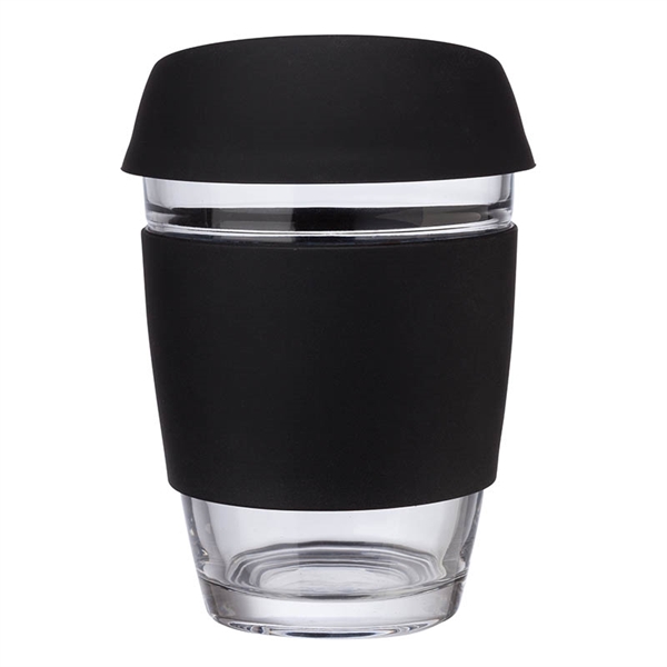 Enjoy the stability of a glass mug, with the confidence of a silicone grip and lid in traveling mug! This 3.62" x 5.25" x 3.62" borosilicate glass mug holds a big 12 ounces of your favorite brew, and features an easy-to-grip silicone band and secure color-matched lid. The result is a handsome and sturdy mug that's easy to maintain. Choose your accent color and add your organizational or company logo, emblem or message to create a dynamic giveaway at grand openings, product launches, trade show and convention presentations.