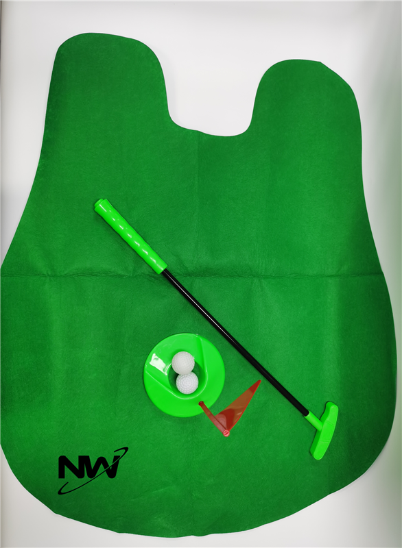 The material of this toilet golf mat is non-woven fabric. It is composed of two balls, a flag, a disc and a rod. You can practice putting while going to the toilet. It is very suitable for golf lovers. Logo can be printed on the mat.