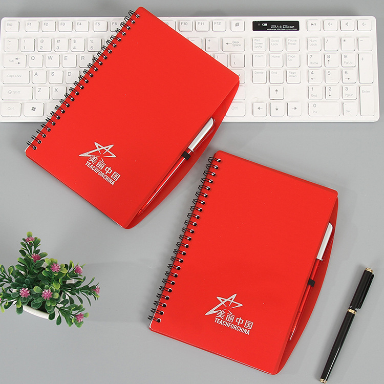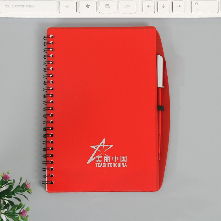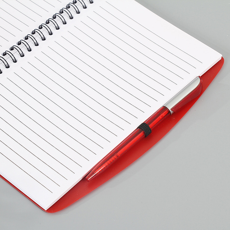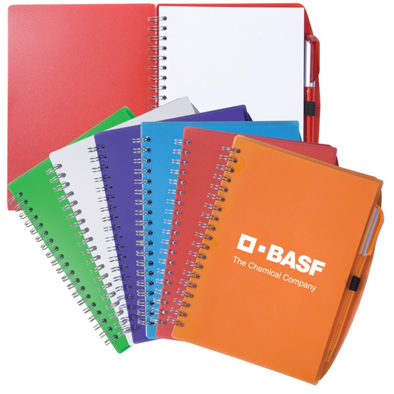 This wire-bound notebook features a durable and flexible translucent polypropylene cover, and includes 70 lined sheets of 4.53''x6.89'' notebook paper and an elastic pen loop with pen. The included translucent color click action pen matches the color of the notebook, comes inserted, measures 5.33"L x 0.33" Diameter, and features black ink. Price include one color logo on notebook and pen .Complies with Prop 65. 5.65" W x 8.3" H