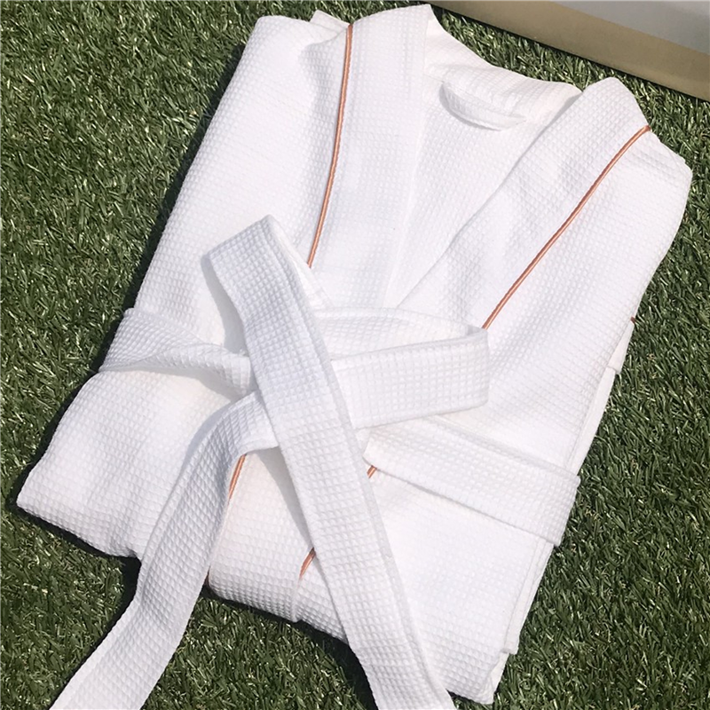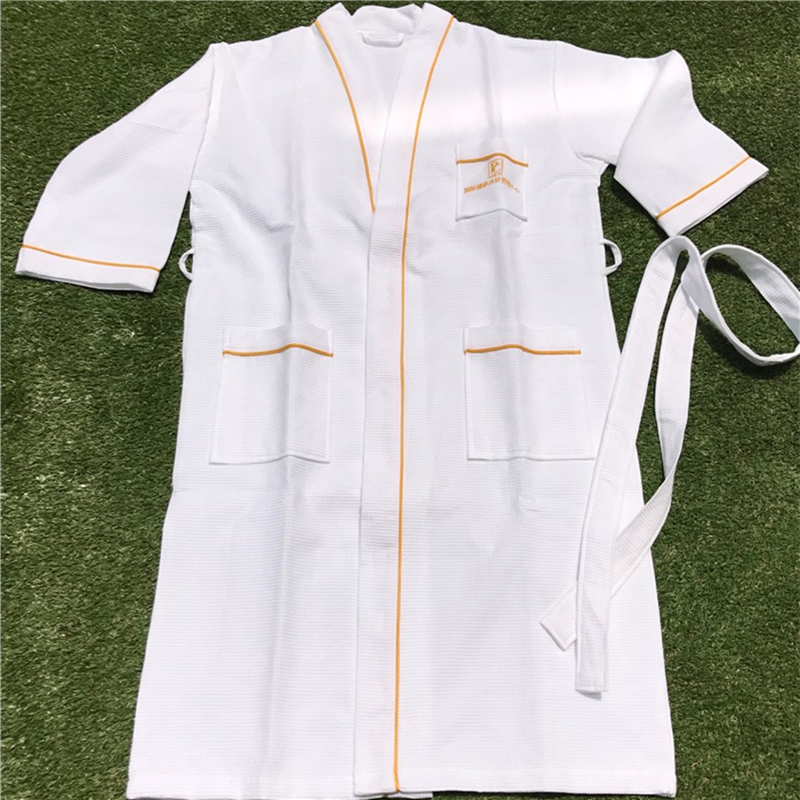 This bathrobe is made of cotton fabric. It is soft and comfortable. It is perfect in any climate.With a belt and in Kimono collar style, it is a gender neutral and one size fits all. It is a perfect giveaway for hotel, spa shop or other beauty institution. It can also be used for bath, spa, shower, pool, beach and travel. You can also print the company's name or logo on the surface of the product.