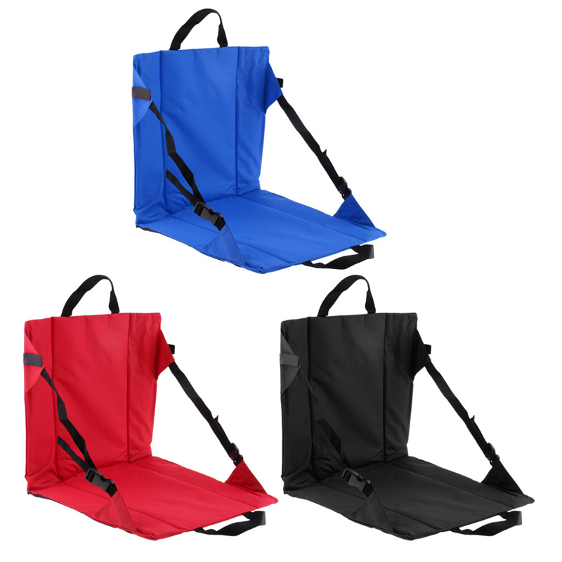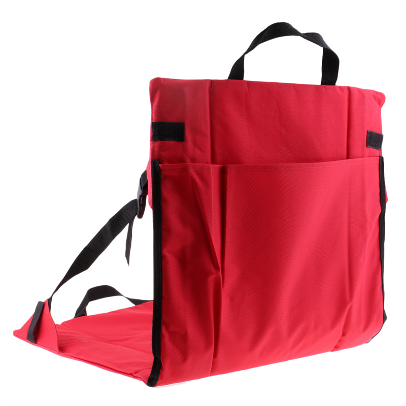 This stadium seat is made of 600 denier polyester. It has adjustable side buckle straps for comfort, elastic band to secure to bleachers, back panel with zippered pocket for quick storage, double carrying handles, and adjustable, detachable shoulder straps for easy and comfortable carrying. Pocket Size: 8" wide narrowest point, 10" wide at widest point, 12-12.5" H x 1" D. Measurements are folded. Non-branded label/tag. Complies with CPSIA. 14" L x 14" H x 2" D