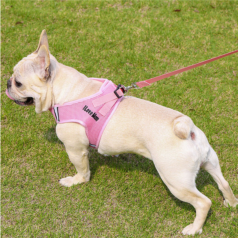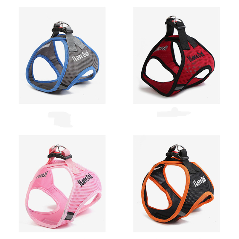 The material of this dog harness is polyester cotton. The mesh fabric is comfortable and breathable. Suitable for dogs with neck sizes from 12" to 21.5" and chest sizes from 12" to 29.5". It provides a more comfortable and safe connection than a collar. The size, shape and color of the logo can be customized.