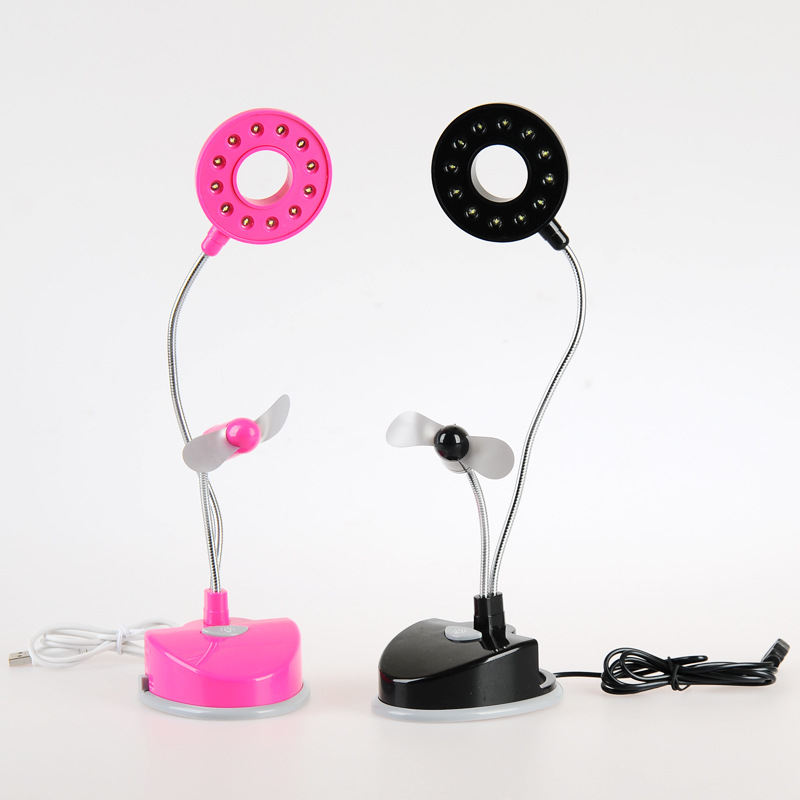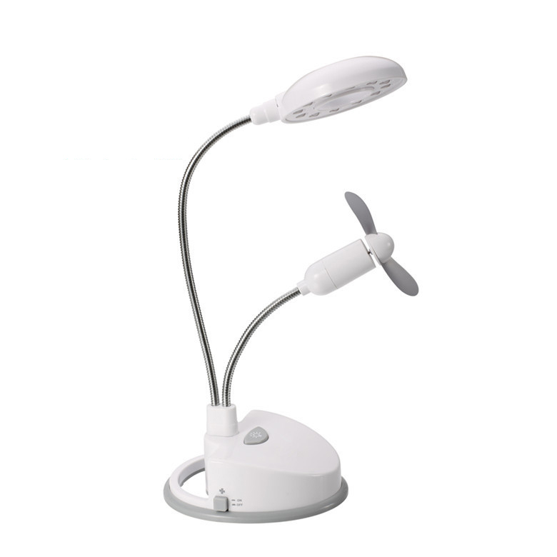 Mini led lamp with fan can be powered by USB on Notebook/PC/laptop/Desktop. With super bright 13 LEDs Light, bright but soft light, quick light on without blinking; eye sight protection. Flexible metal necks for any angle adjustment ensure the Table Lamp long usage. Light switch on the base. Fan switch in the back of the fan.