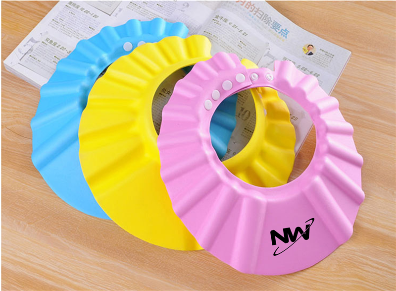 The material of this shower cap is EVA. Softer than silicone. It is more friendly to babies' sensitive skin. Our shower cap has an adjustable strap that can be stretched to fit your child's head. It is designed to prevent water and soap from flowing into your baby's eyes. It can also be used as a hair cutting device or sun visor. Your logo or artwork can be printed on it.