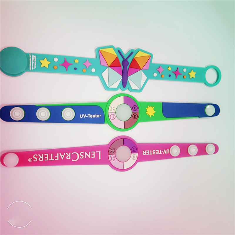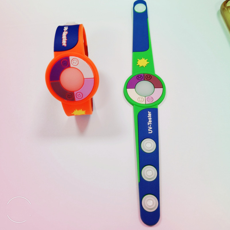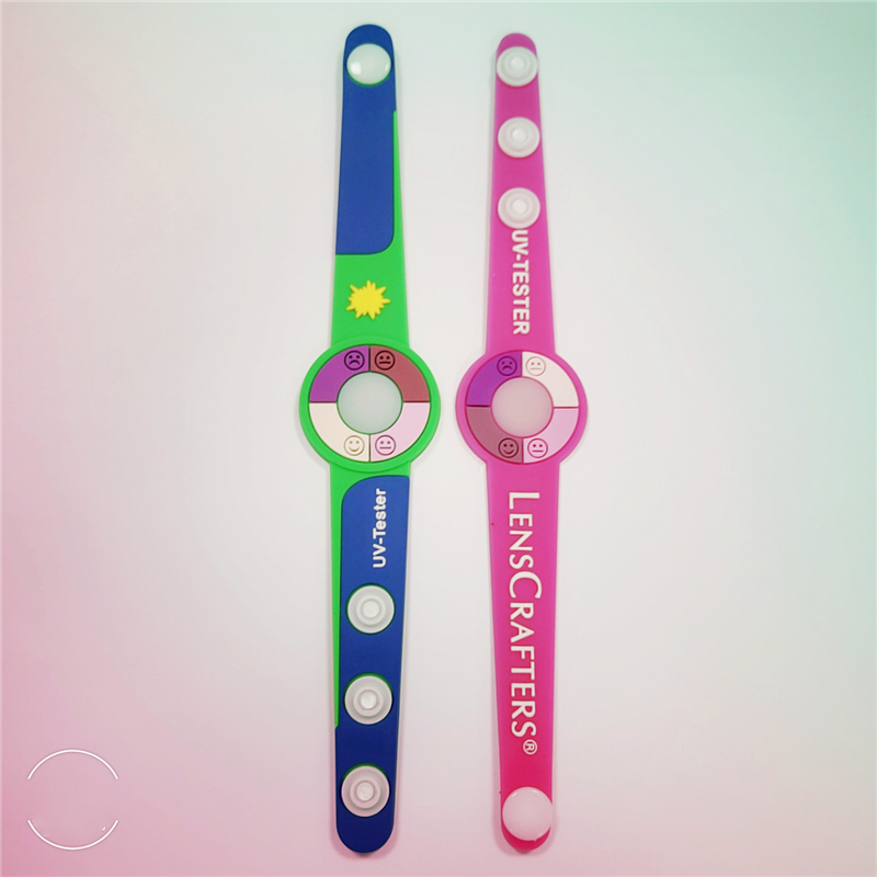 The UV meter wristband/bracelet is a very good marketing premium. You can use it to check solar UV radiation index levels: UV Index 1 (low), SPF & lt 5, UV Index 3-5 (mod), SPF & lt 10, UV Index 6-7 (high), SPF & lt 30, UV Index 8-10/11+ (extreme), SPF & lt 50+. The higher the solar UV radiation, the darker the color change. Enjoy the sun and avoid sunburn with Ever King's Solar UV bracelet now. 9" L x 1 1/2" W