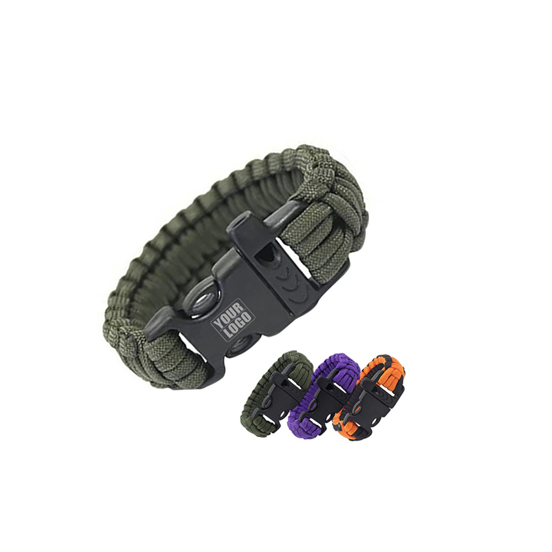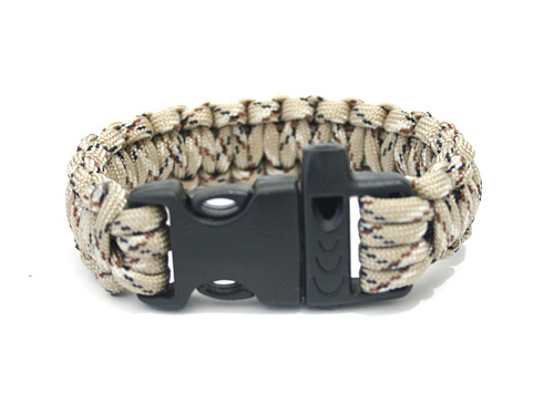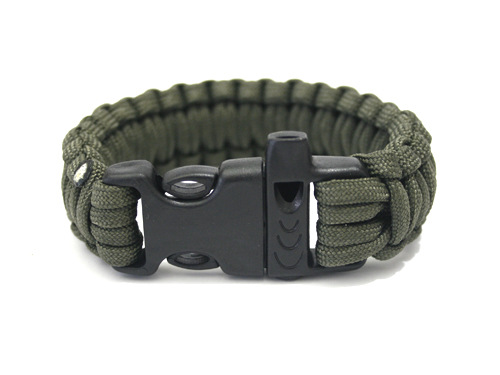 From tactical to practical, this stylish bracelet is a must have for survivalists, hikers, campers, or anyone who doesn't want to be caught unprepared in an emergency situation. Features include - approx. 10 ft of polyester tactical paracord, built-in emergency whistle, easy-release plastic buckle, makes a great event wristband, uses include: Shelter line, tourniquet, tent string, boot laces, belt, arm sling, fishing line, snares and traps, gear repair, luggage tags, log pull. 9.5" L x 1" W