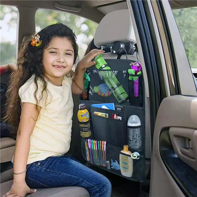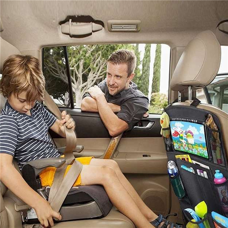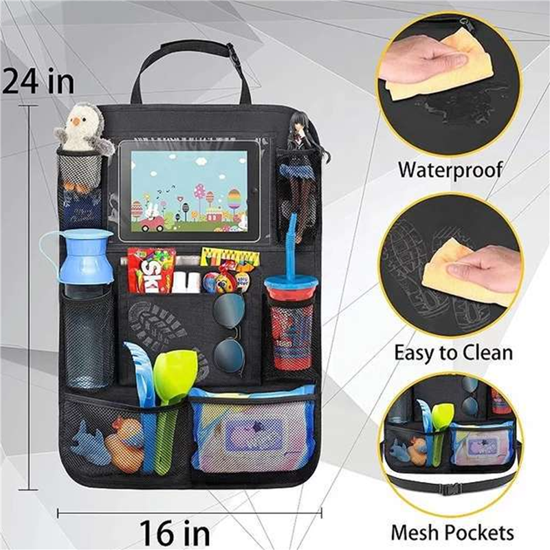 This item is made of high quality oxford,and stronger net line on the mesh. Strong and tough enough to hold the heavy grocery in your car trunk, waterproof and washable make you worry free after traveling.Tablet pocket with a clear viewer window, keeps kids and back seat passengers entertained.The car seat organizer have been widened and expanded 4 mesh pockets on the original basis, which can accommodate more items than other products. It's convenient to organize things on backseat or trunk.