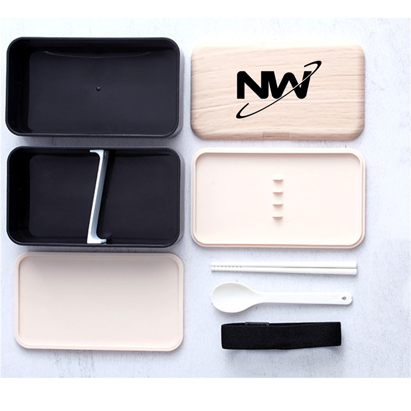 The material of this lunch box is pp+ps+pe. With removable compartments to keep food separate and safe. It has matching tableware. It can be heated in a microwave oven.Your logo or artwork can be printed on it.