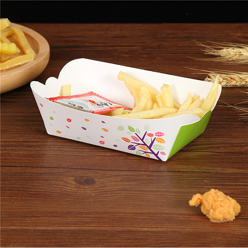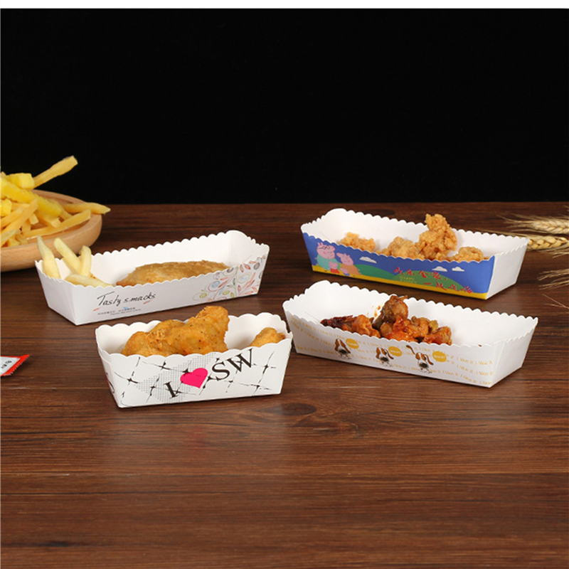 The material of this food tray is 350gsm white cardboard. It is very suitable to provide some food for your brand. Suitable for festivals, carnivals, street fairs, sports events and fairs. It is recommended to use a food liner to prevent product stains caused by greasy food. Very suitable for printing company logo and pattern.
