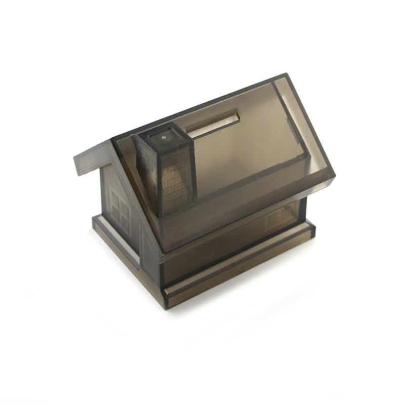 The material of this house bank is PS. The red, translucent, house-shaped bank is very suitable for construction companies, real estate offices, banks, financial consultants, etc.! . There is a detachable bottom for retrieving coins. Very suitable for printing company logo and pattern.