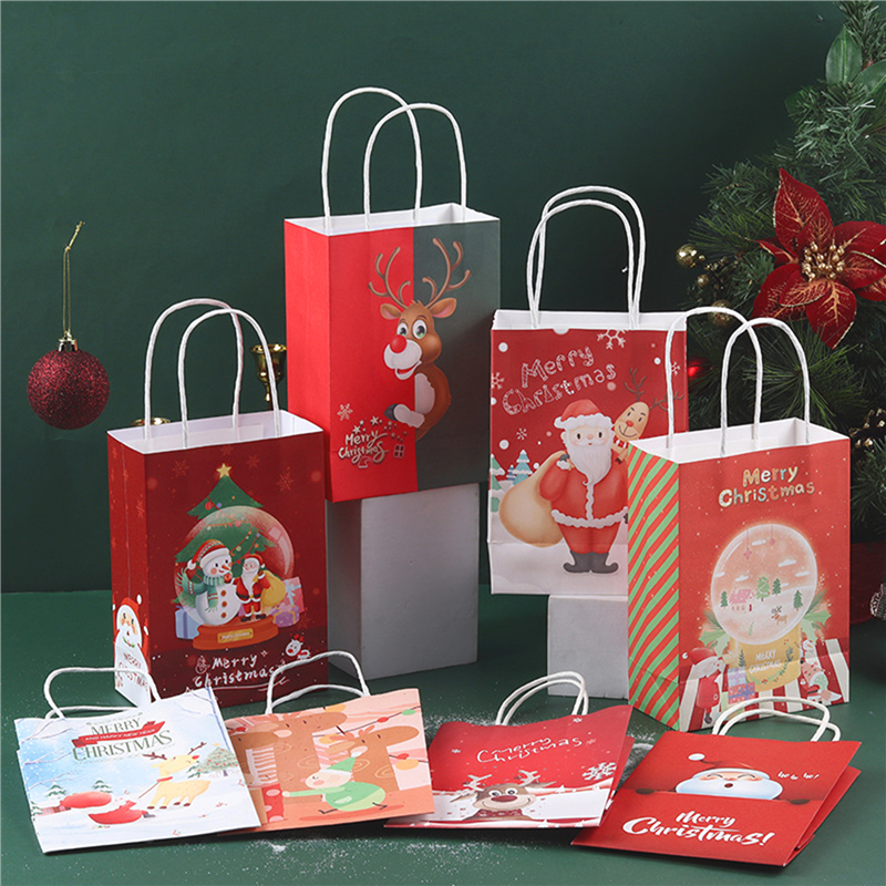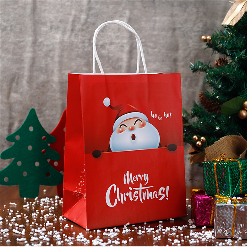 This shopping bag is made of kraft paper. This bag is perfect for packing candy and any gifts at Christmas. With twisted rope handle and it is durable. You can customize the pattern or size. If you need it, please feel free to contact us.