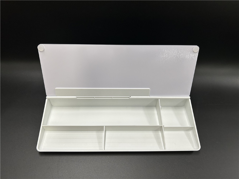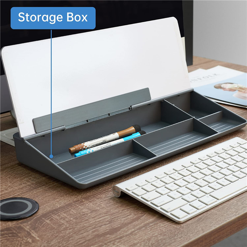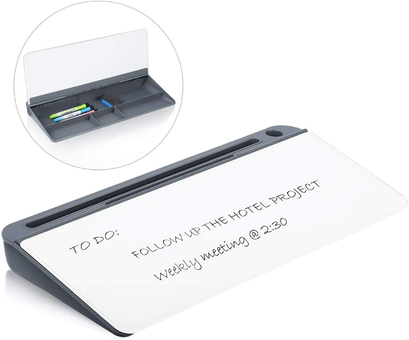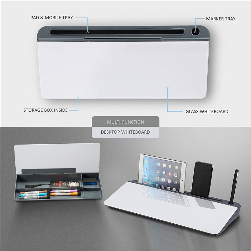 Made with tempered glass, the surface is non-absorbent and scratch resistant. No need to worry about stains or ghosting, the whiteboard can be wiped clean after using. Designed with 4 interior compartments, the desk companion is the perfect addition to home, office or school. Keep all of your pens, markers, sticky notes, chargers and other office supplies right where you need them. The top features a built-in tablet/phone holder and a space for your pens/markers. Custom logo is available.
