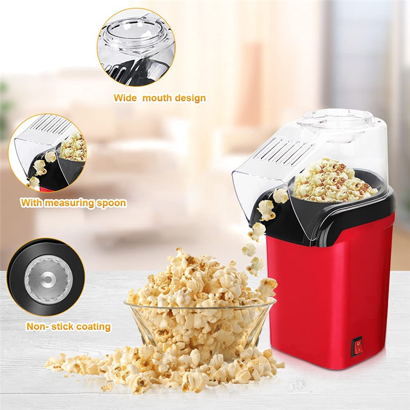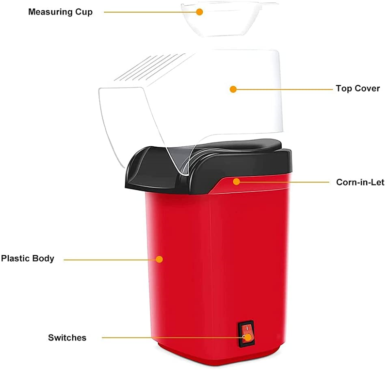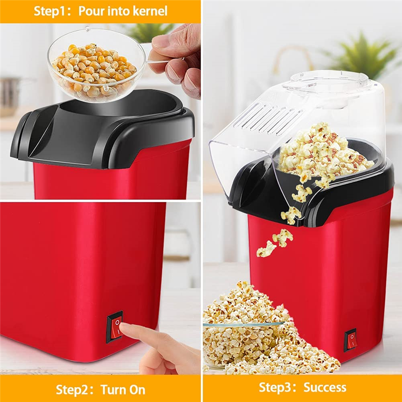 The popcorn maker operates with an advanced hot air system and its power is up to 1200W, much higher than similar items on the market, so you can enjoy delicious popcorn in less than 3 minutes. What's more, its popping rate is up to 95%.This popcorn maker is easy to clean, which means you spend less time tidying up and have more time to enjoy treats. All you need to do is wipe it clean with a moist towel, and that's about it.