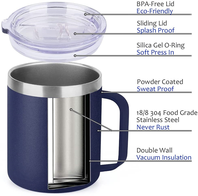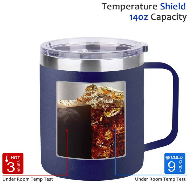 This coffee mugs are with double walled vacuum insulation technology, keeping your favorite beverages hot for 3+ hours and cold for 9+ hours. Sweat proof, no condensation.The insulated coffee mug is made from premium 304 food Grade stainless steel, never rust, lead free, easy wash and unbreakable. Each cup is powder coated for a durable finish, no scratching, peeling or fading.