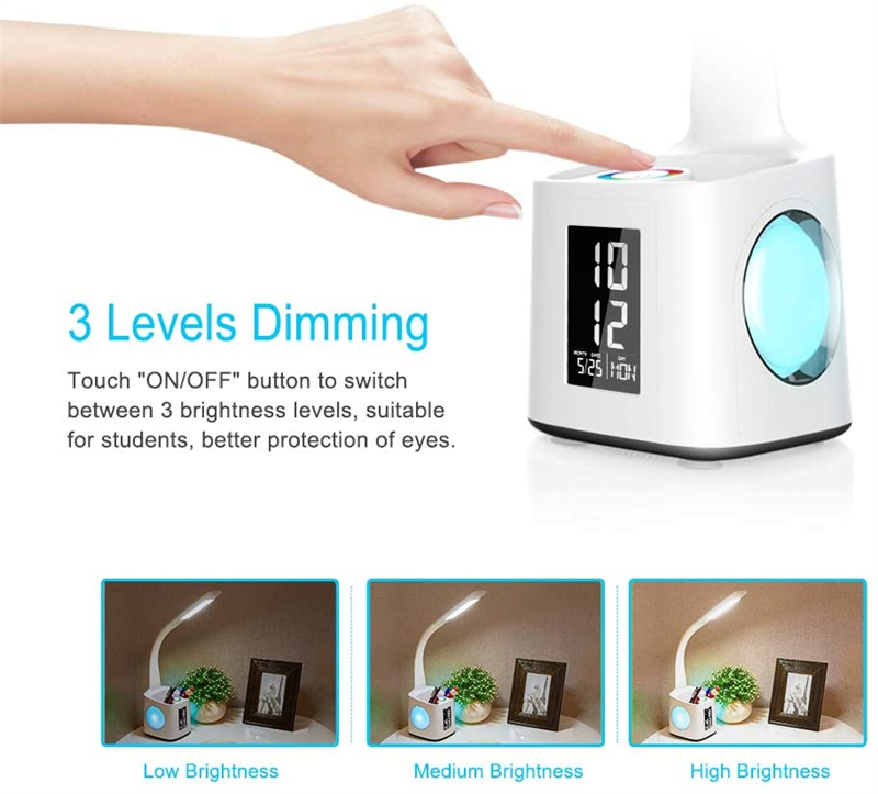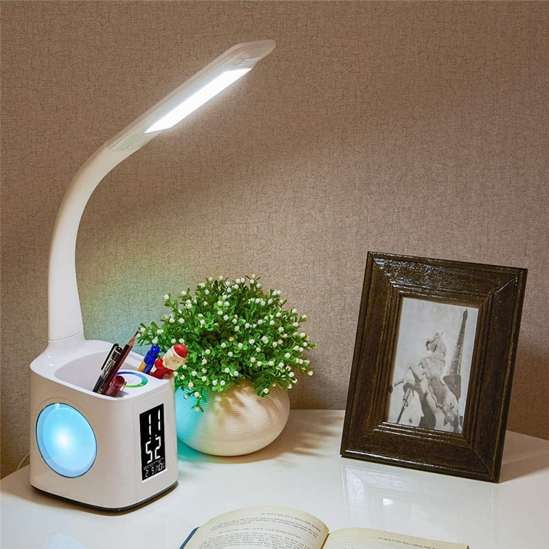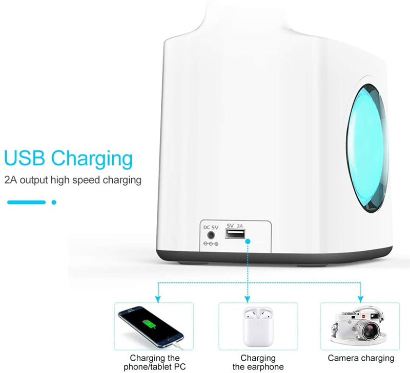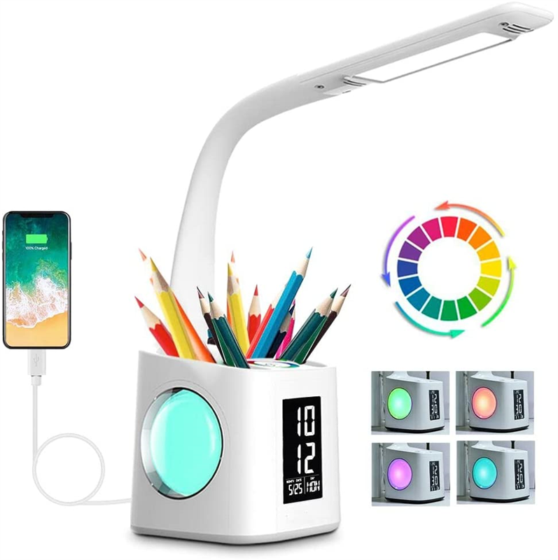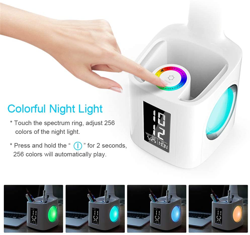 7 in 1, desk lamp with USB charging port, 256 color changing base, pencil holder, clock, calendar and LCD screen, it meets all your requirements. USB Port: Output 5V/2A USB charging port,so you can spend less time to remain full electricity for your mobile device.Touch the spectrum ring to adjust 256 color changing base, create any variety of atmosphere at the night. If hold down the spectrum ring for 2 seconds, the color would cycle automatically, now you can color your night and life with this magic lamp.
