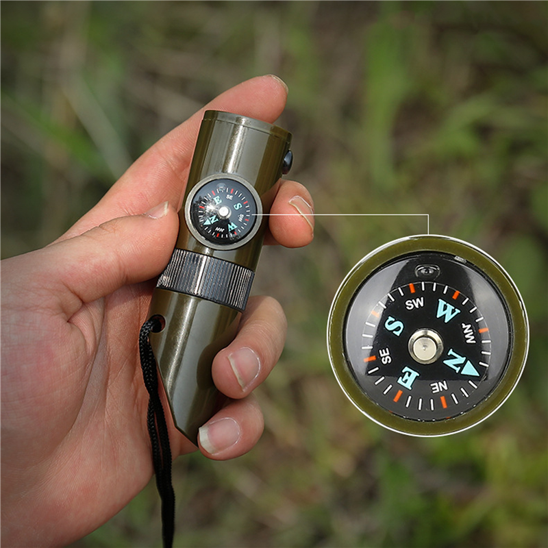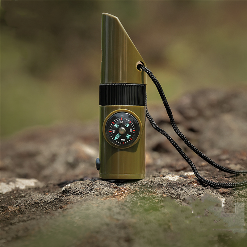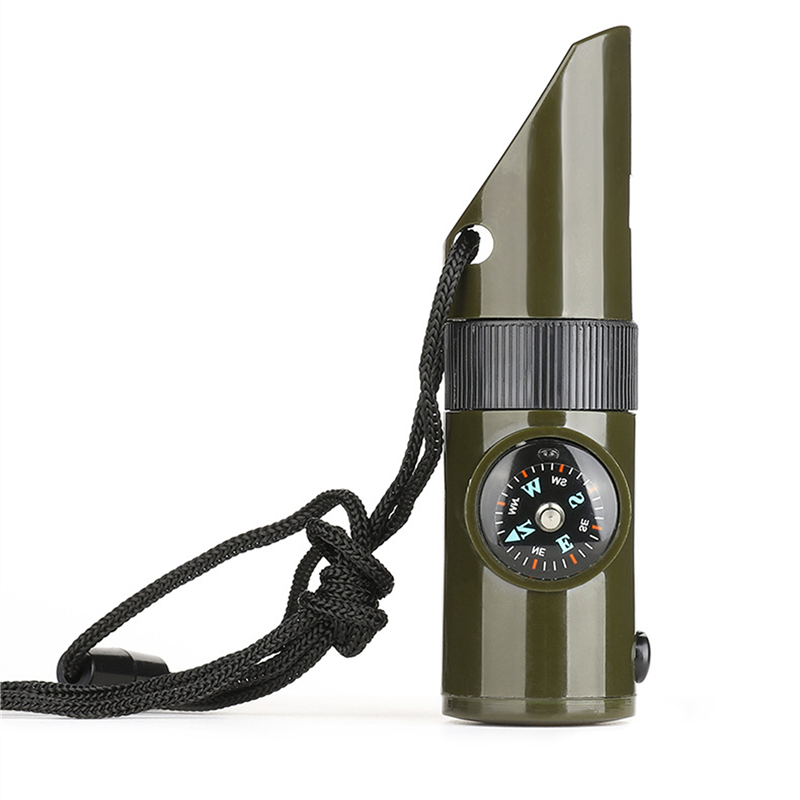 The whistle is light and practical. Especially suitable for field use. Whistle in the wild not only has the function of blowing the whistle, but also has the function of life-saving! Multi-functions together: whistle, compass, thermometer, magnifying glass, mirror, LED light, small storage bin. It is camping adventure, travel and leisure products.