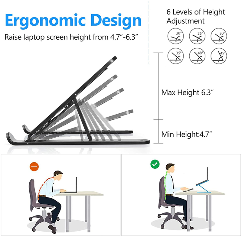 The laptop holder offers 6 levels for height adjustment, elevating your laptop from 4.7 in to 6.3in above the tabletop. Prevents you from hunching over your screen, which helps to fix your posture and reduce back pain, neck stiffness, wrist aches and eye strain.It is a perfect desk partner to get rid of the bad posture while using laptop.