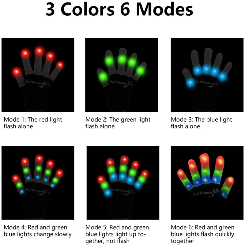 It’s a new kind of glove, and more fun than ever! Outfitted with RGB colors, these LED gloves have 6 different modes (alternating strobe, alternating flash, permanent on, flash red, flash green, and flash blue), with an easy on/off button hidden in the cuff.