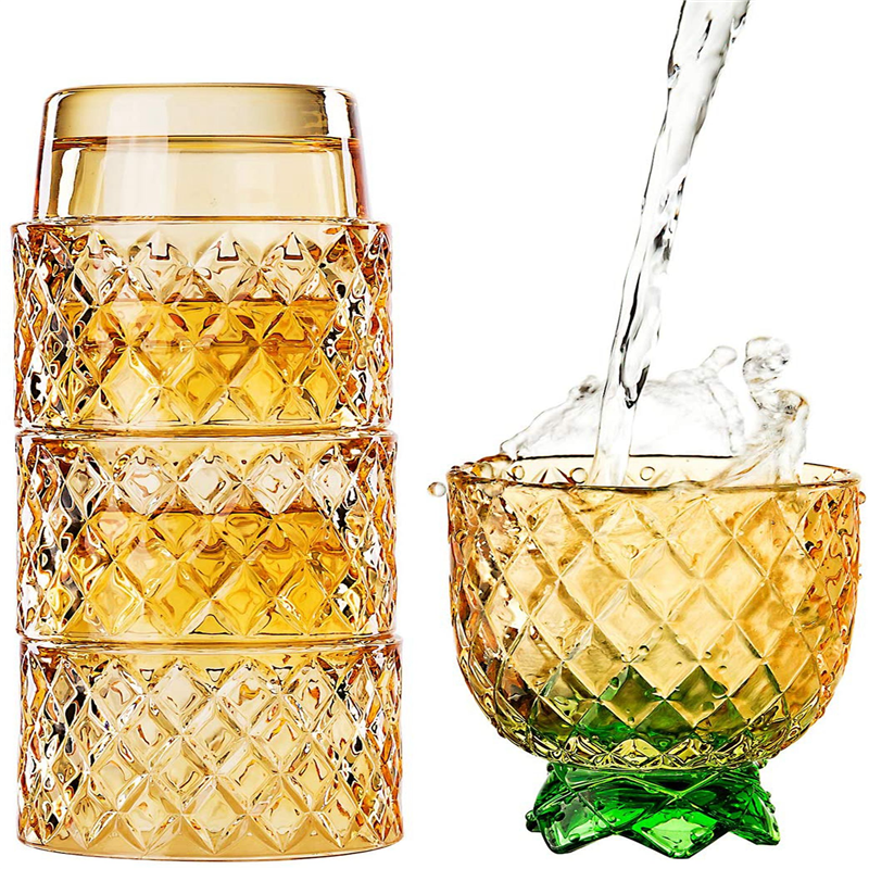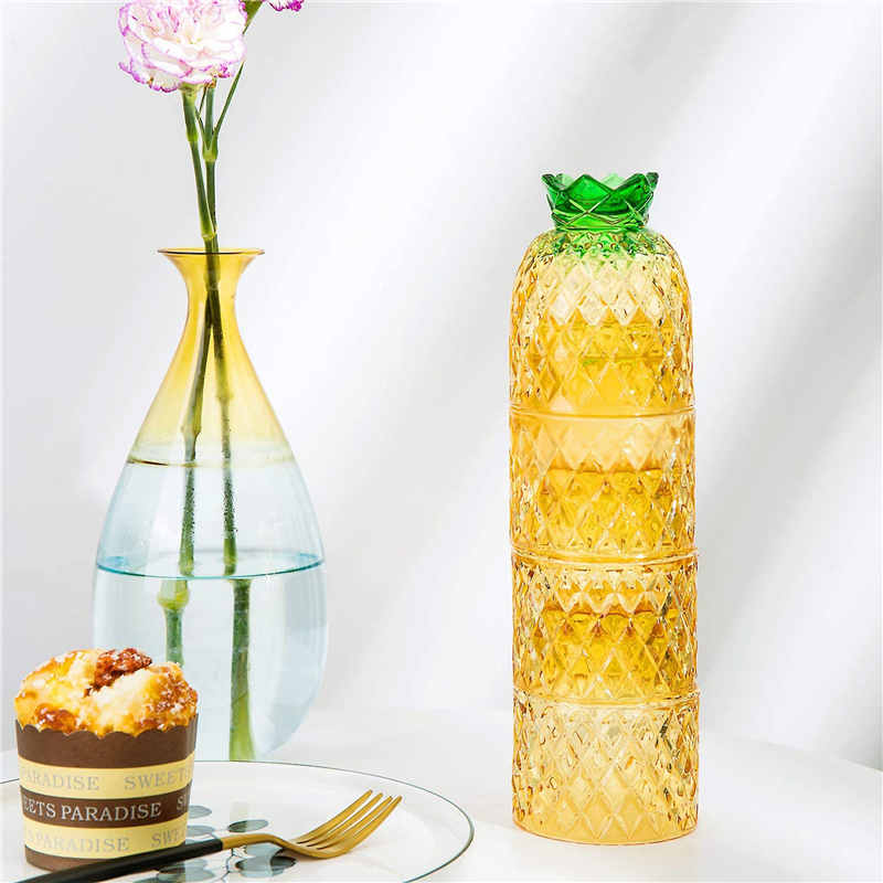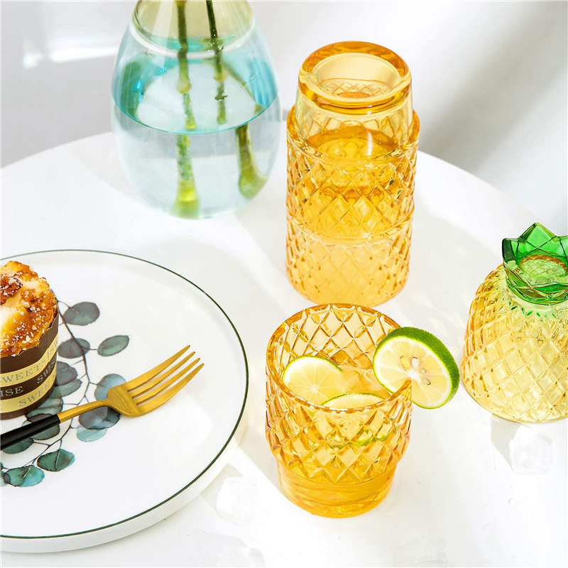 This glasses designed to resemble a whole pineapple, there has 3 yellow cups with pineapple pattern and one cup with leaves. This set shows as a pineapple when stack all four cups together, and when pulled apart reveals four water glasses. Our Stacking Tumblers are made from toughened glass, safe for use just about anywhere from a school canteen to a busy kitchen. Features an indented base, designed for easy stacking without trapping air and getting stuck.Guaranteed to bring life and vigour to your drinks, your home or kitchen will more distinctive with these tumblers. Add a colorful touch to your kitchen or outdoor area with this Creative Ware 10.5-oz glasses Tumbler Set. (Each cup is almost 10.5 oz / 250 ml). The price over 5000pcs is for sea shipment.