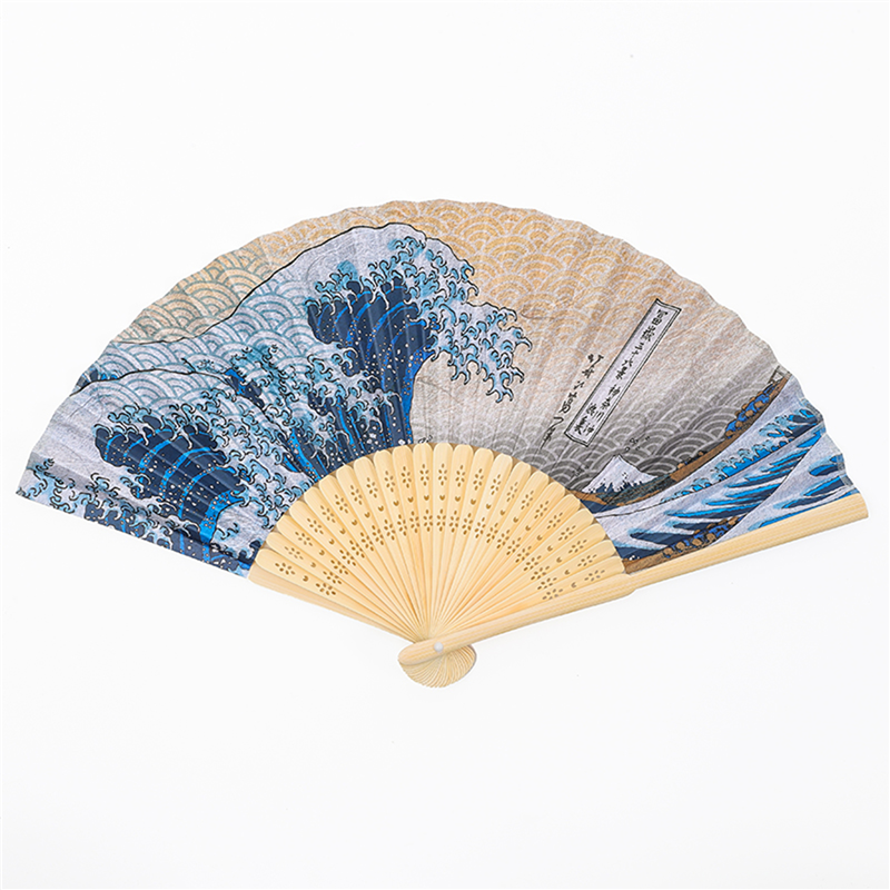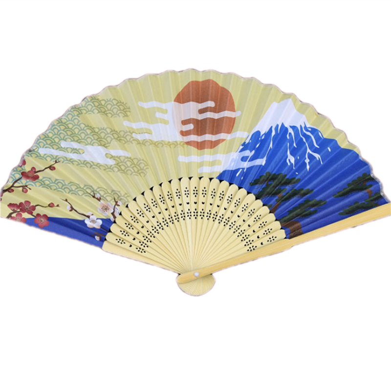 The material of this fan is bamboo. The fan surface is cloth and can be customized. Great for giving as a gift. Can be very good for printing company logos and patterns.